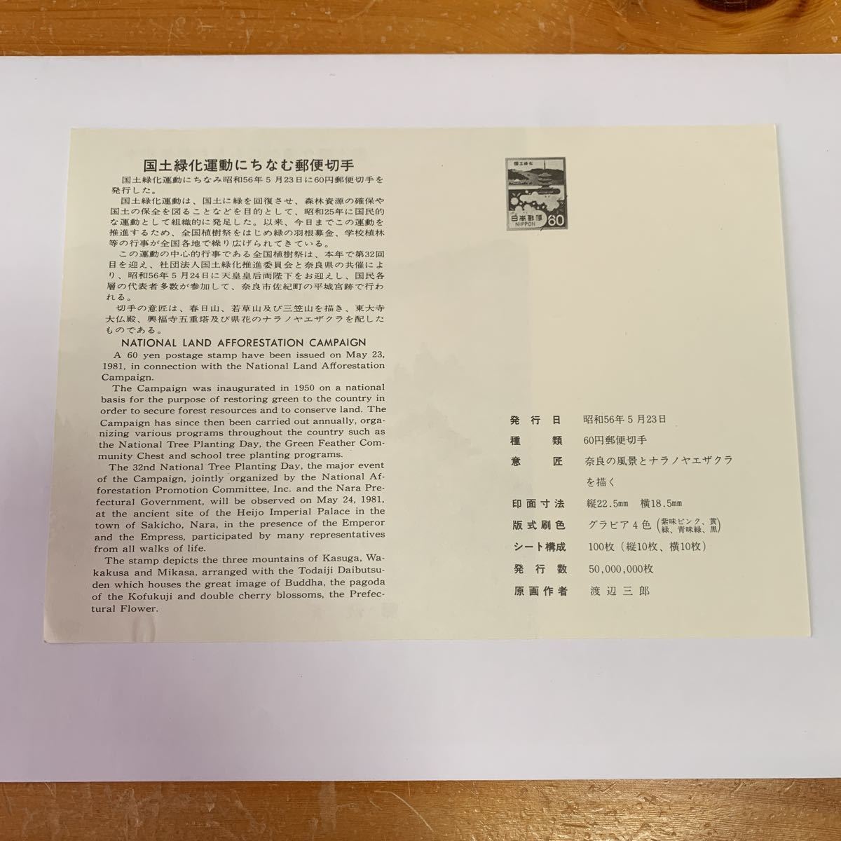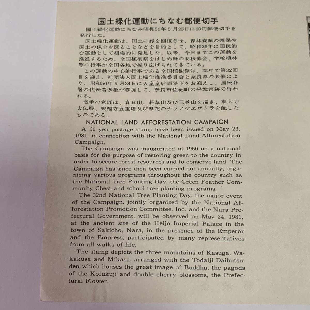 リーフレット 切手なし 1981年 郵政省 日土緑化運動にちなむ郵便切手 昭和56年5月23日 奈良の風景とナラノヤエザクラ を描く レア 希少 非売品 美品 送料無料の出品です。 サイズ横21.1センチ縦15センチ 納戸の整理(断捨離)で今後使用予定が ない為出品しました。 衣装ケースに入れて保管してました。
