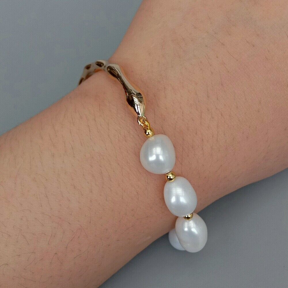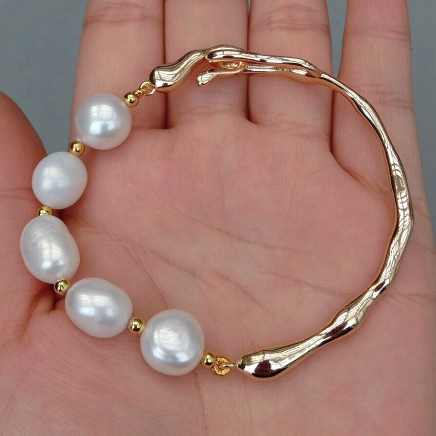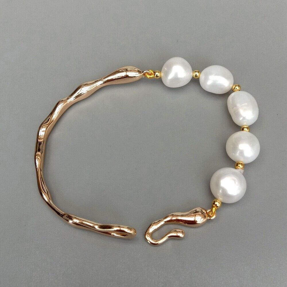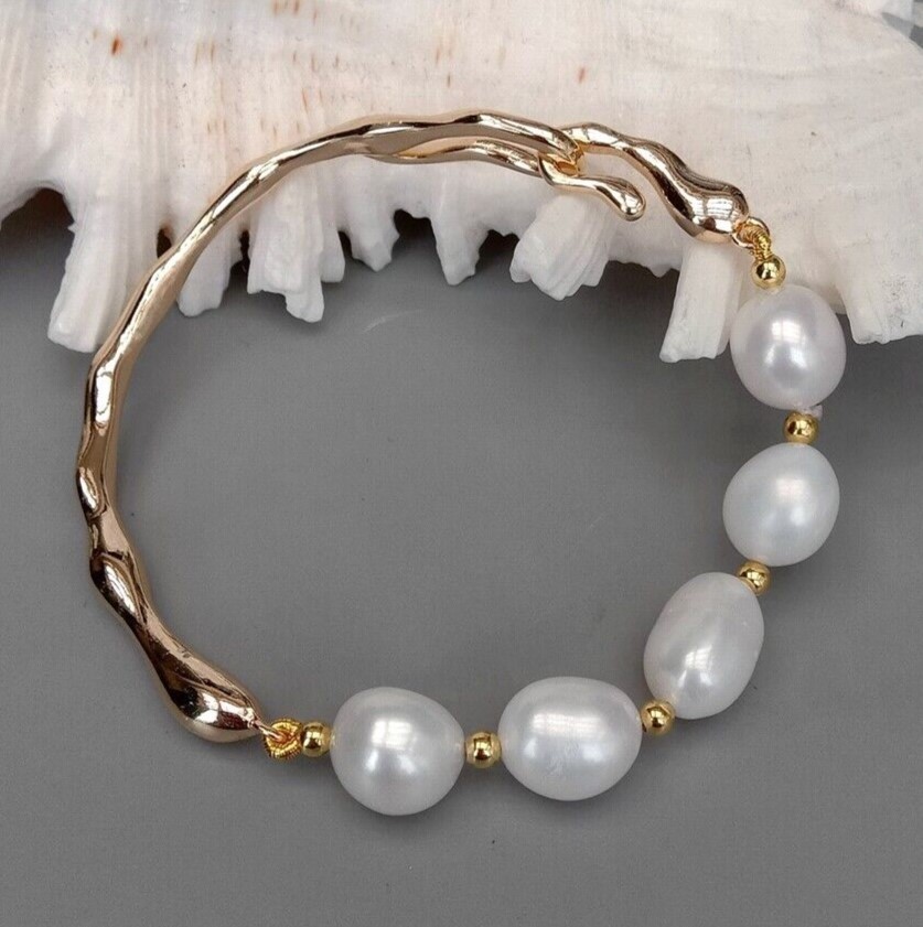 <新品>ホワイト 淡水養殖 パール 真珠 バングル ブレスレット ゴールドプレーティッド 結婚式 お出かけ プレゼント パーティー