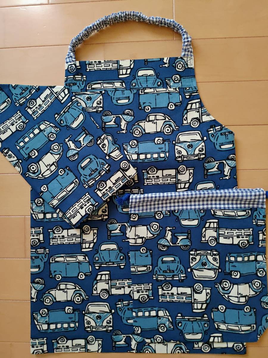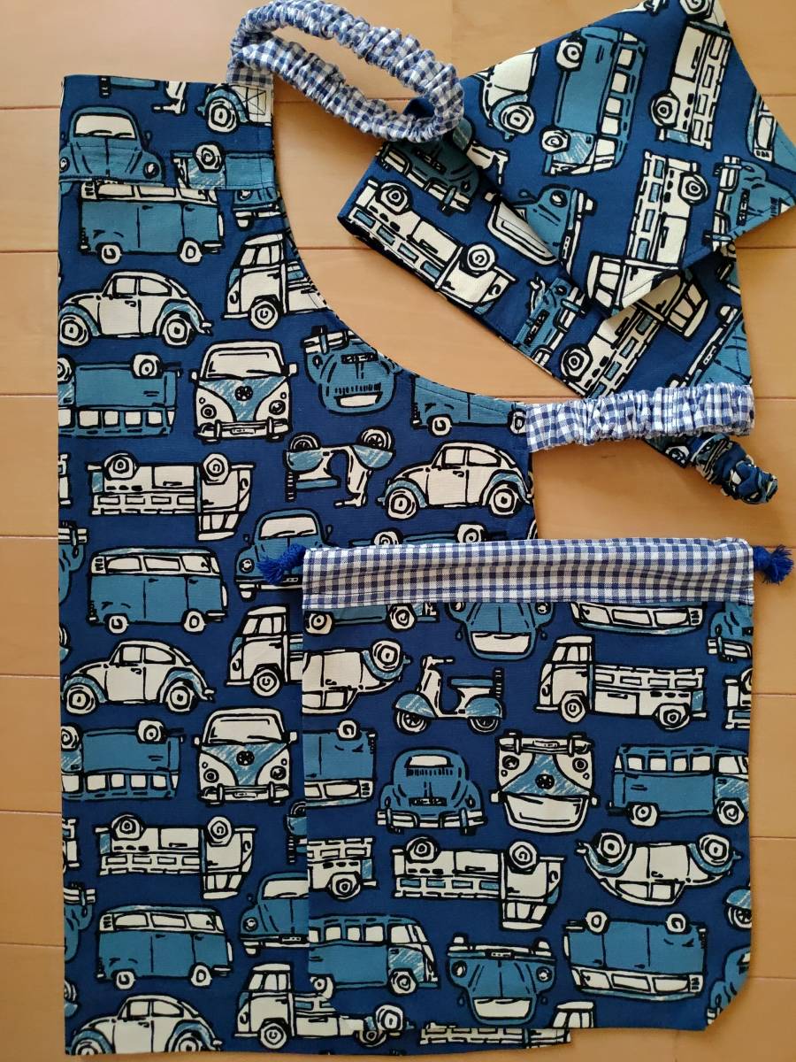 ☆ハンドメイドエプロン3点セット 120前後 くるま柄 ☆