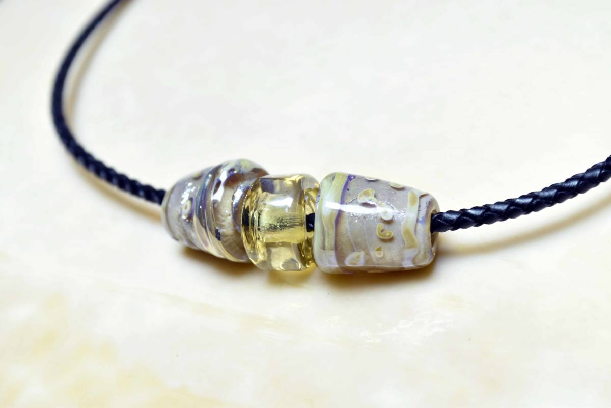 見る角度や光の当たり方で色合いを変える美しいガラスのネックレスに仕上がりました