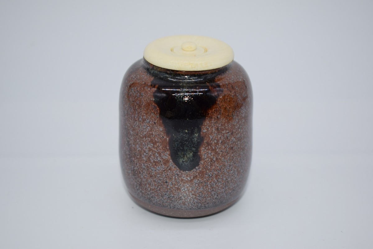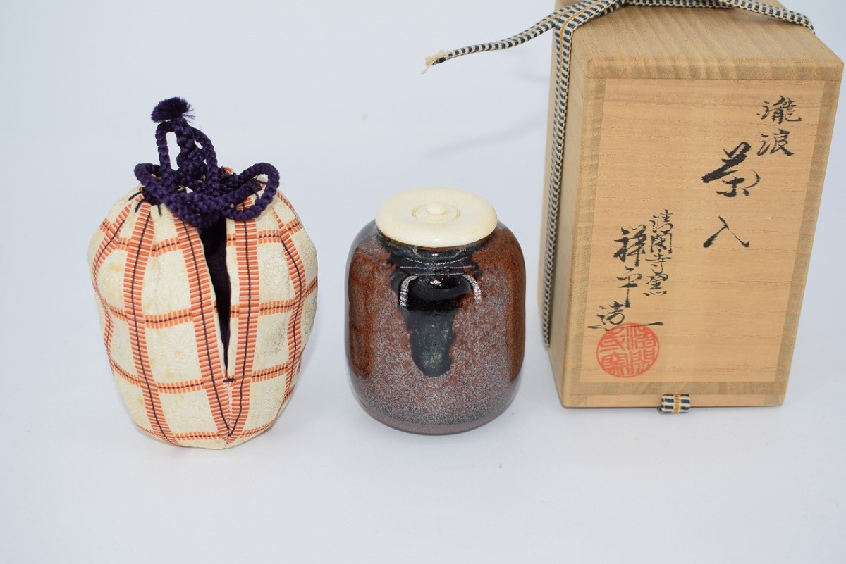 茶道具 瀧浪写 茶入 清閑寺窯 作 仕服:波上梅花紋緞子・日野間道 茶道 仕覆 茶入れ 仕服込み(胴径6.2cm 高さ8.2cm) 仕服にシミ、木箱の汚れ、焼けはありますが、本体はしっかりしています、お稽古にお使いになるには差し支えありません。