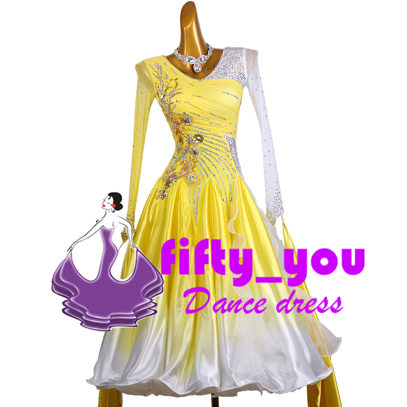 新品fifty_you セミオーダードレス レディース社交ダンス衣装 モダン競技デモ用ダンスドレス ゴージャスストーン飾り グラデーション 黄白