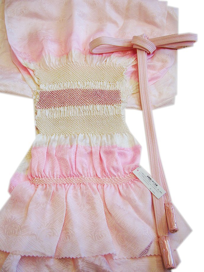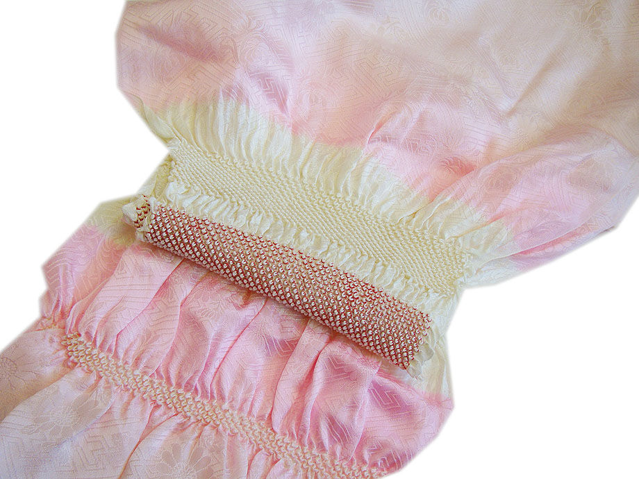 ●帯揚: 正絹。 うすピンク色地に灰色の絞り柄 長さ148cm 幅30cm(絞った状態での寸法です) ●帯〆: 正絹。 ピンク色地の平組の組紐 長さ158cm 幅1.3cm |