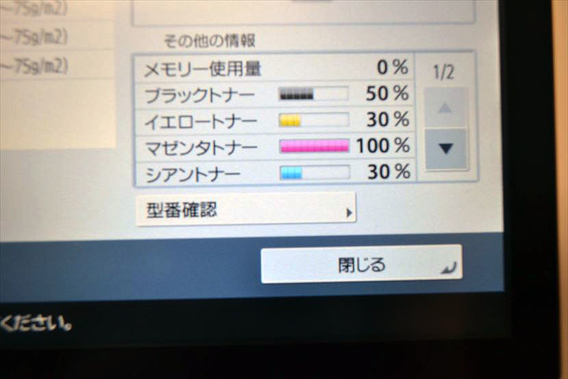 | ■トナー残量 | BK:50% C:30% M:100% Y:30% 出荷前の動作確認で減る場合がございます。  |