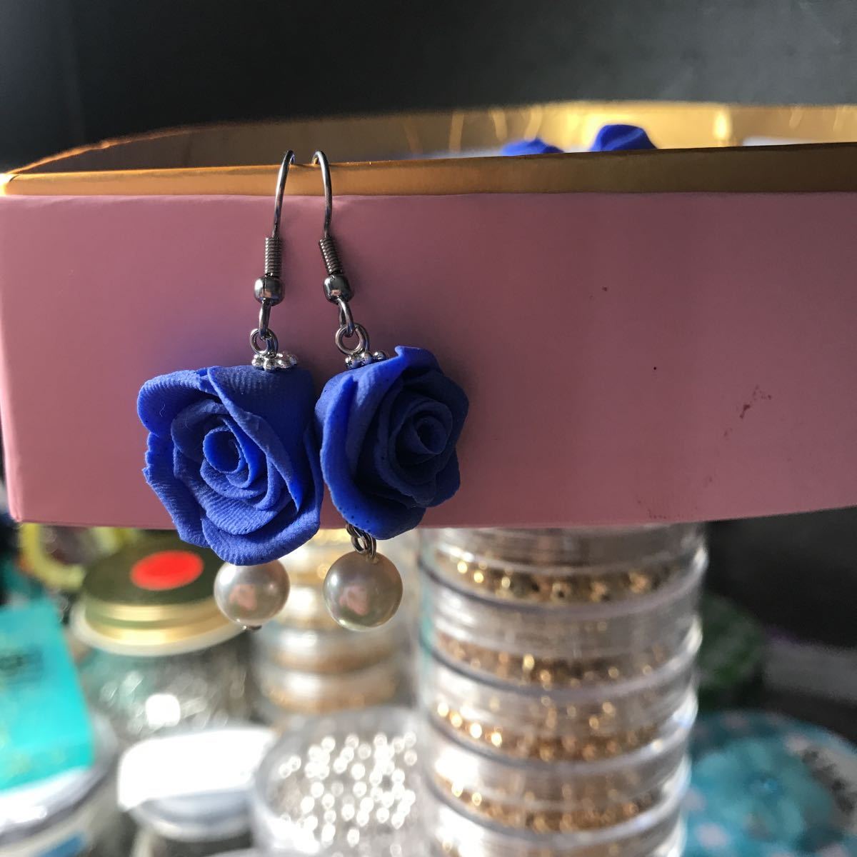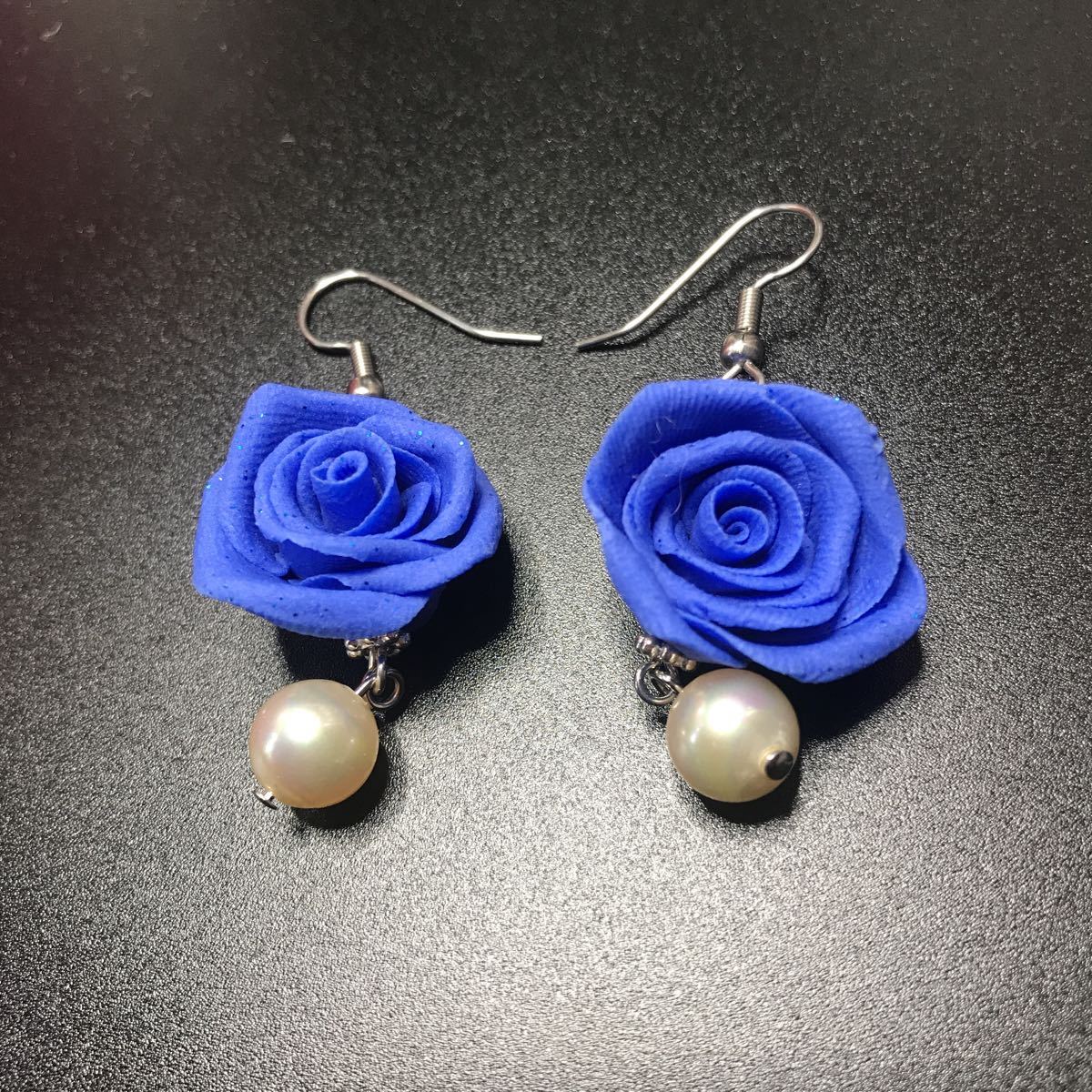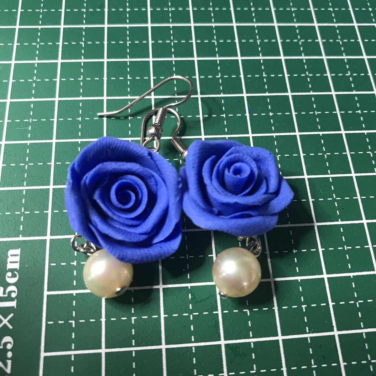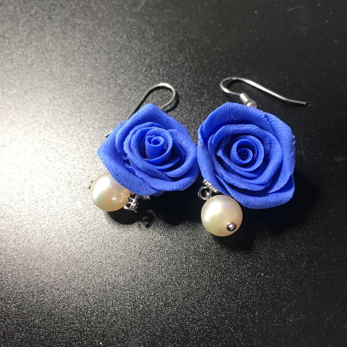 ラメ入り青薔薇とマジョリカパール8ミリをピアスにしました。フックはステンレス使用しております。