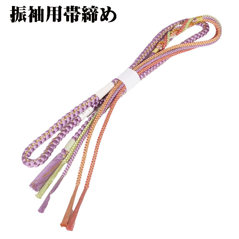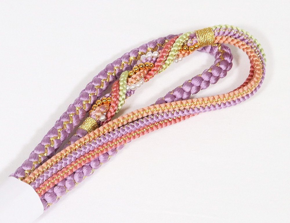 振袖用 帯締め 帯締め 組紐 丸 藤色に金の編みに サーモンピンクが2本・薄緑が1本・藤色が1本の細編み 飾り付き 未使用品 | |