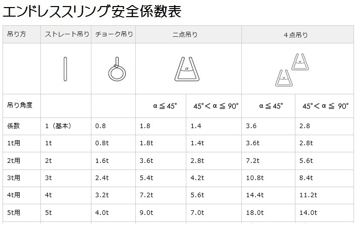 (6)同じ製品でも荷の吊り方により最大能力が異なります。使用荷重表を参考に余裕のある荷重で作業してください。