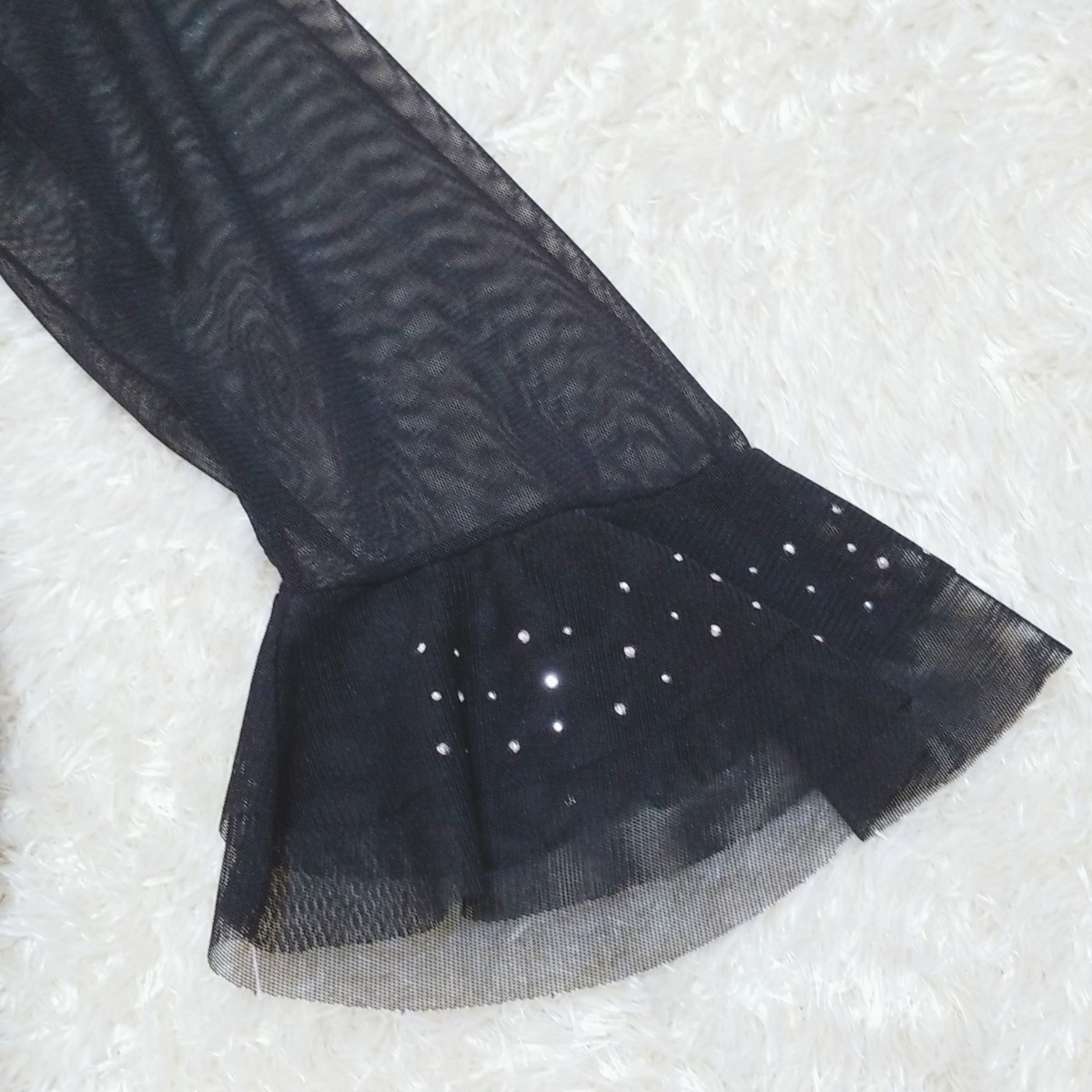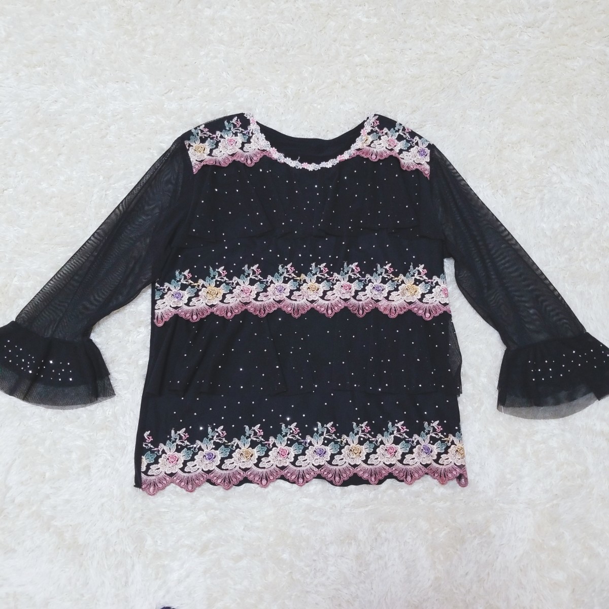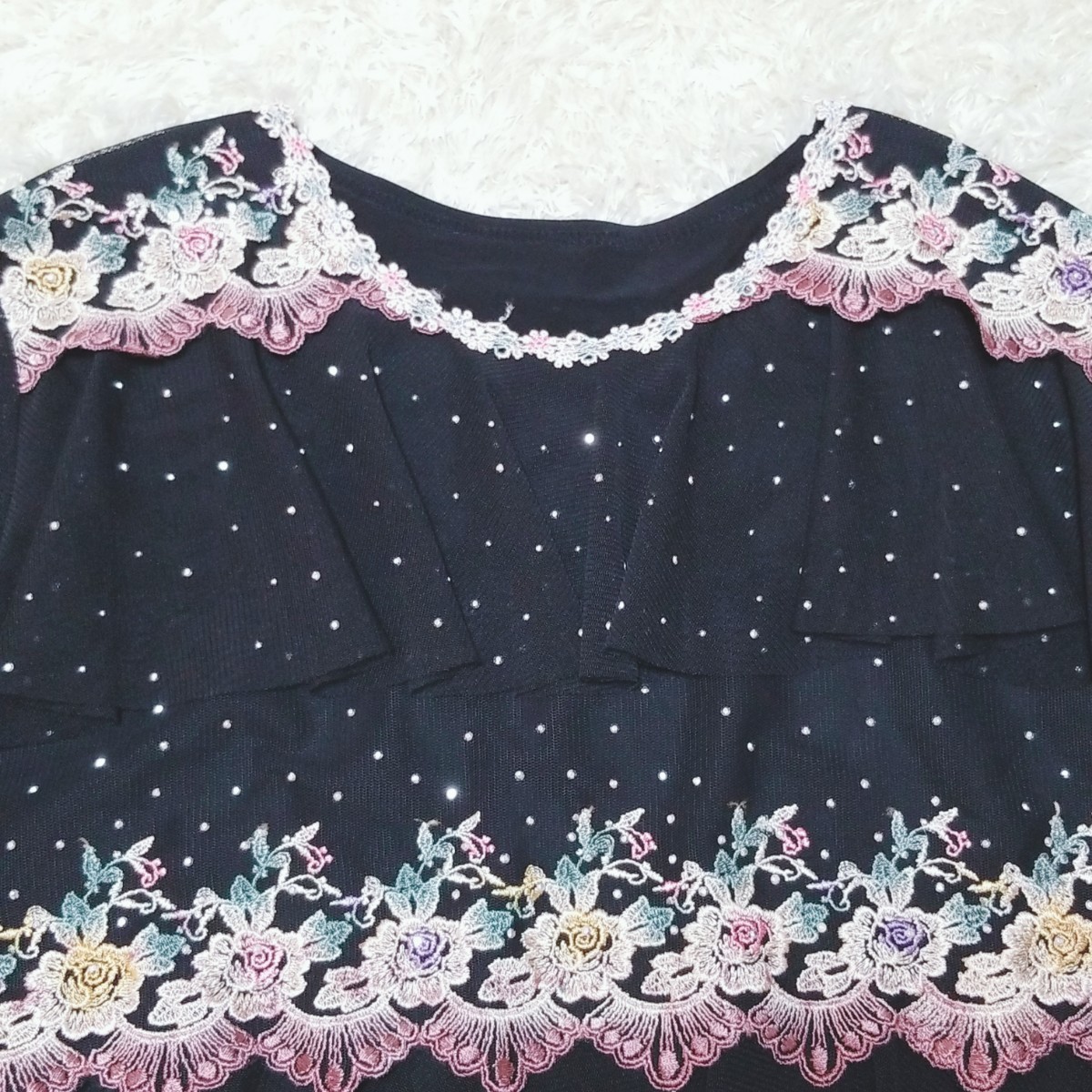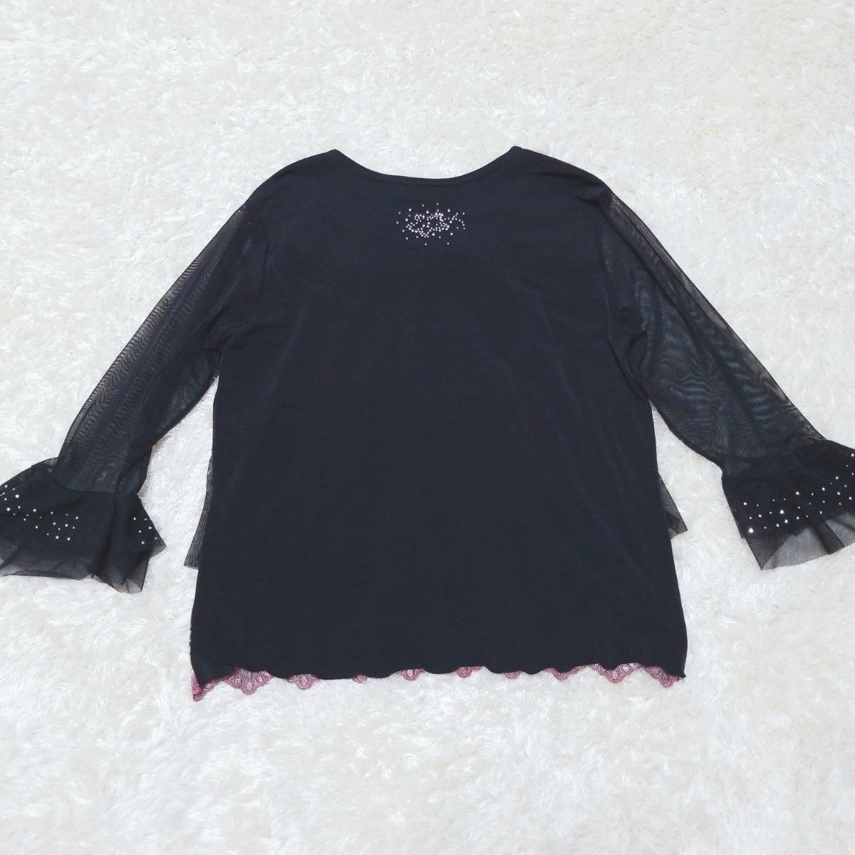 ★美品★刺繍レース ラインストーン シフォンティアードカットソー 袖シアー トップス レディース L相当 ブラック Y807