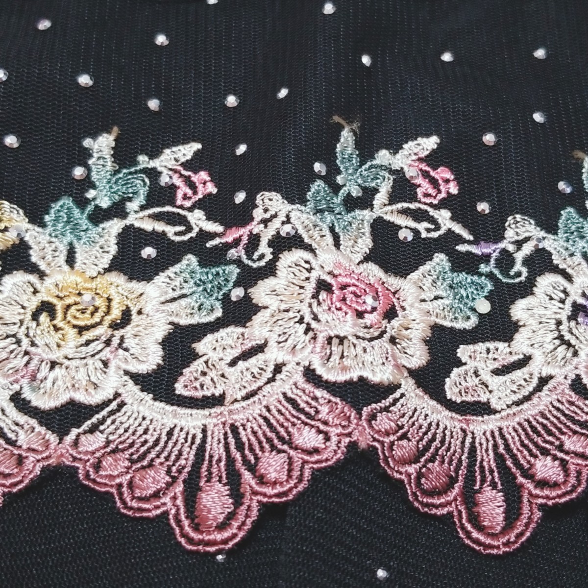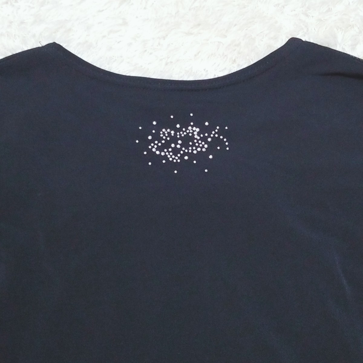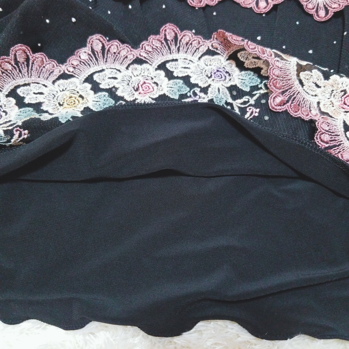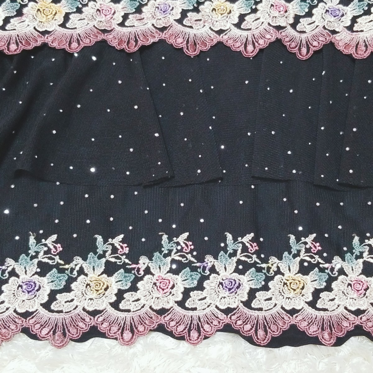 ★美品★刺繍レース ラインストーン シフォンティアードカットソー 袖シアー トップス レディース L相当 ブラック Y807
