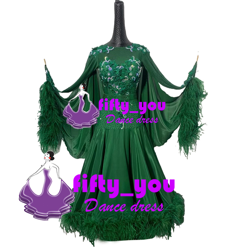 新品fifty_youオリジナルデザイン レディース社交ダンスドレス サイズオーダー モダンパーティドレス ワルツドレス 濃い緑色 ファー付