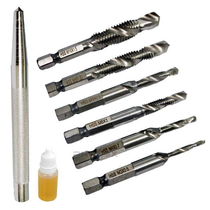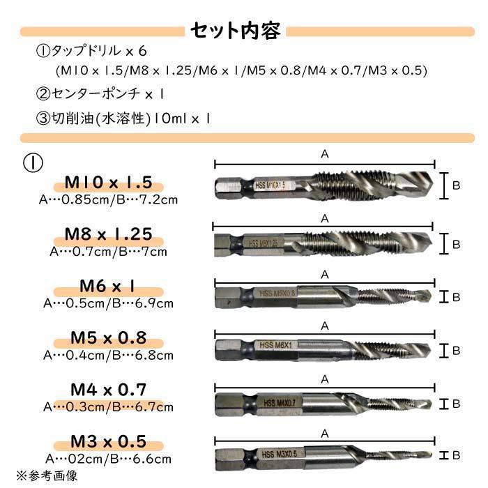 ■商品内容:タップドリル x 6、センターポンチ x 1、切削油 約10ml(水溶性) x 1