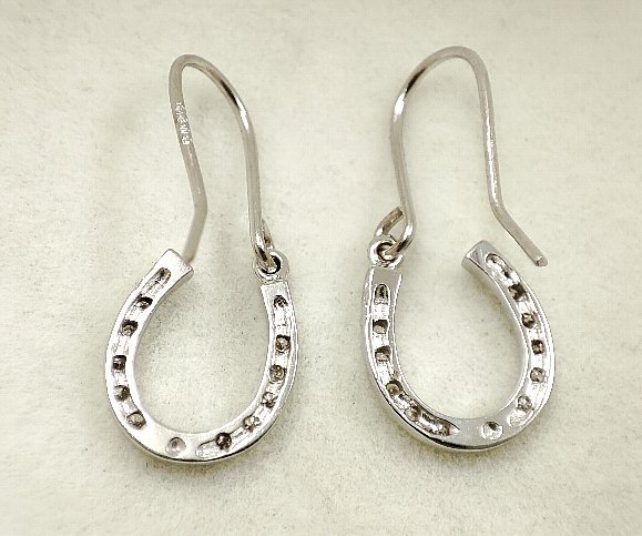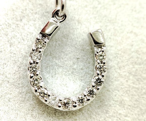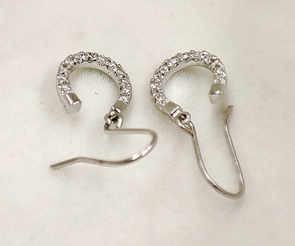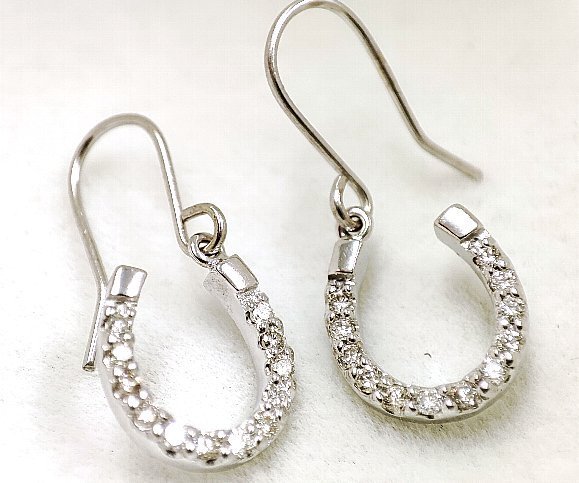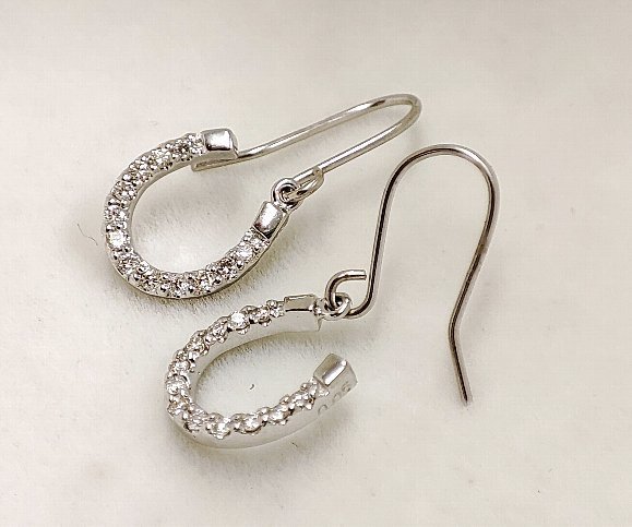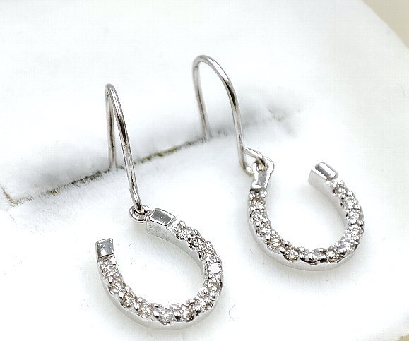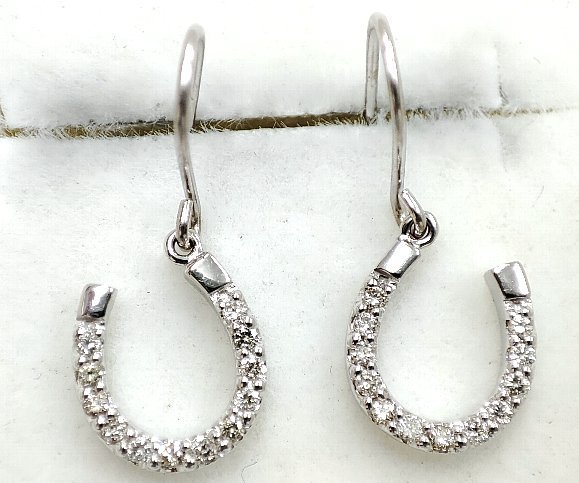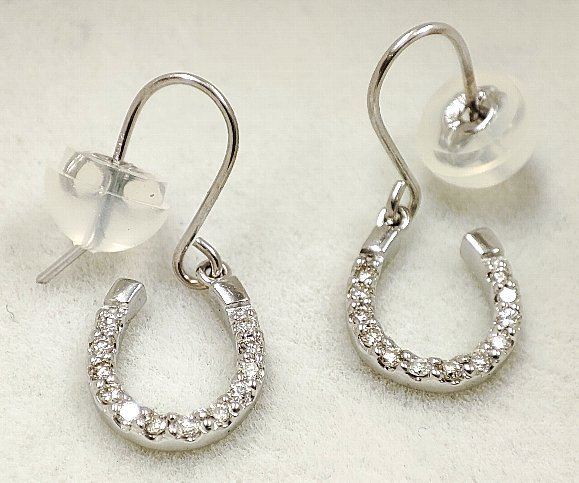 素材は、18金ホワイトゴールドを使用し馬蹄を模ったアメリカンブラピアスです。 合計、0.10カラットの天然ダイヤモンドを馬蹄型のデザイン上に石留めしています。 ピアス金具はアメリカンタイプでピアス針の太さは、0.5ミリです。 ダイヤモンドのクラリティは主観になりますが、SIクラスからIクラスになります。 小粒のダイヤモンドですが輝きは有り綺麗です。 |