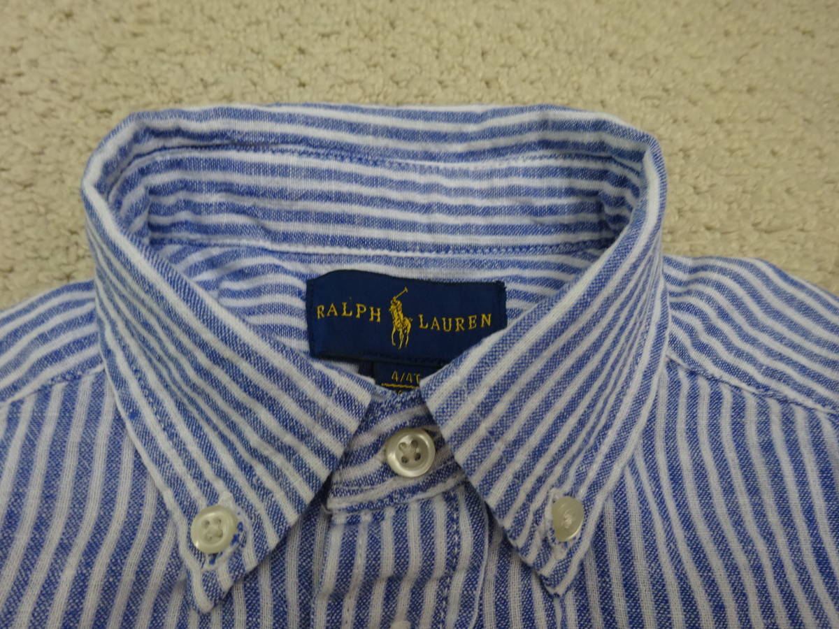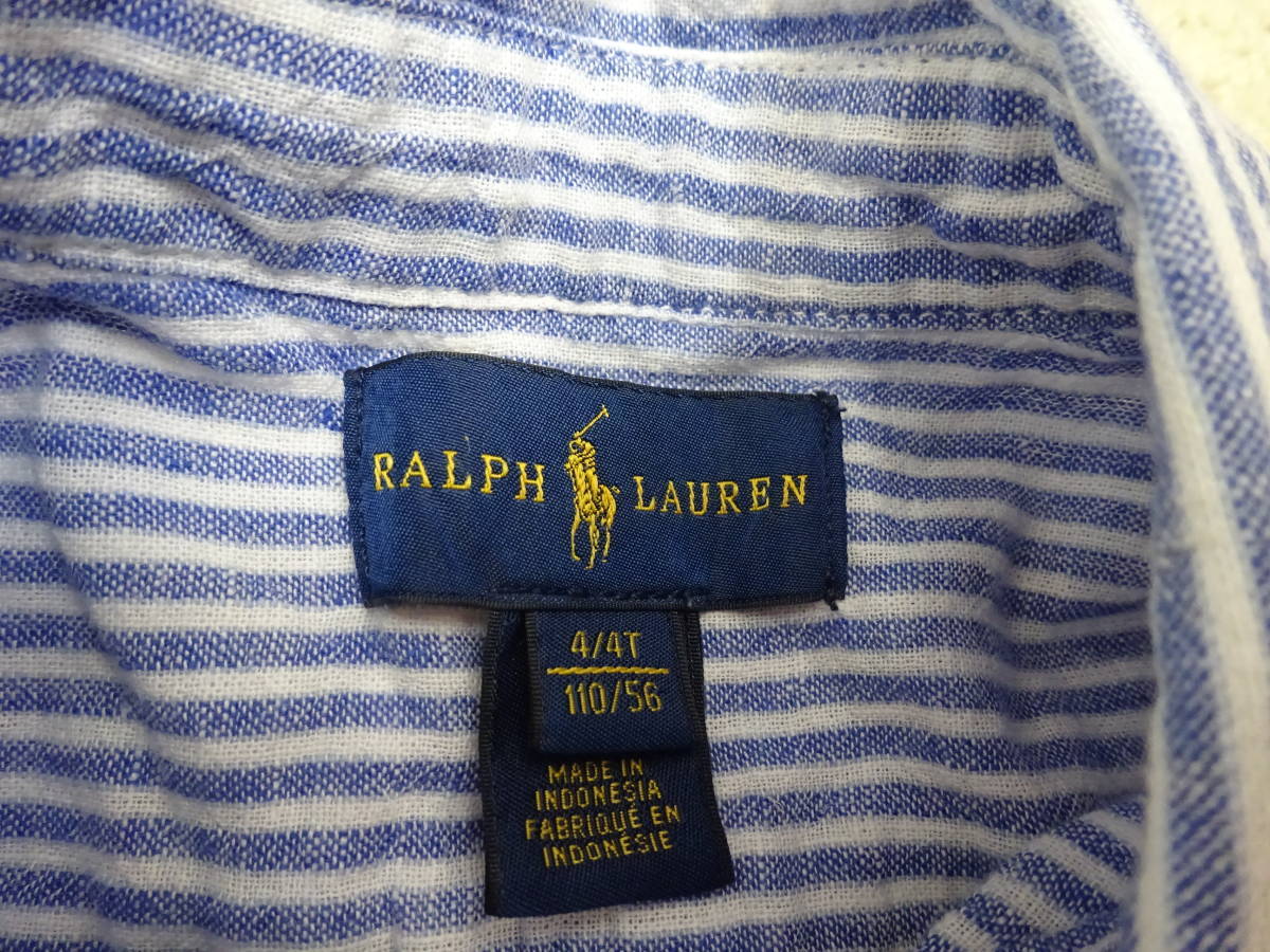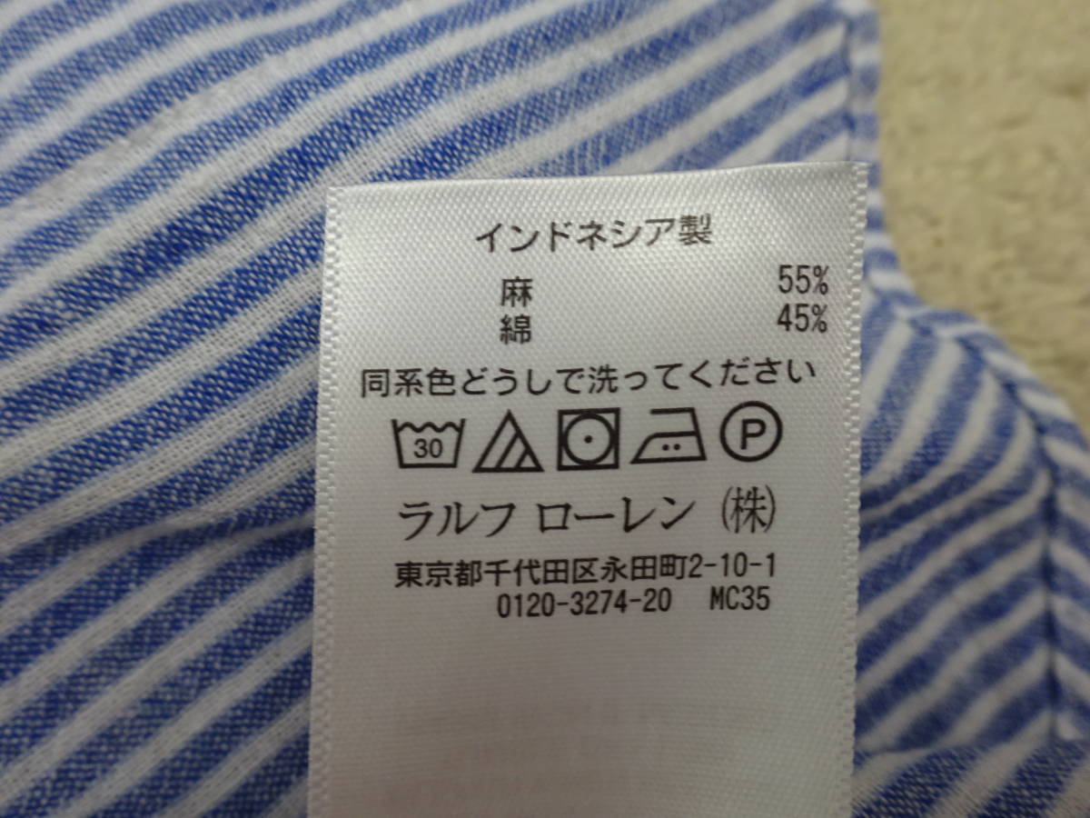 ■Ralph Lauren ラルフローレン★麻入り リネン 麻綿素材 ストライプ柄 涼やかな半袖ボタンダウンシャツになります。 ■お色は白×青系のストライプ柄になります。 サイズ表記は110です。 素材: 麻55%、綿45%、ラルフローレン製 ■左胸に紺色のポニー刺繍があり、麻入り素材で、涼やかな感じで、とてもオシャレな1枚です♪ ■目立つようなシミ・汚れなどはなく、着用感も少なく、全体的綺麗な状態です。美品ですが、USEDとして上記の状態をご理解いただける方のご入札をお願いします。 | |||