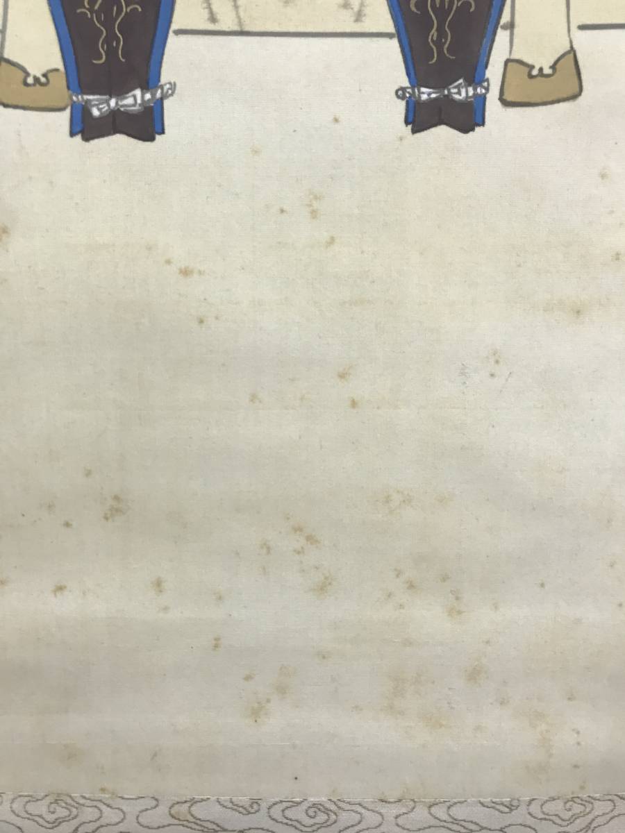 【作品状態】 本紙は絹本肉筆です。本紙は薄汚れ、全体に多数の糊シミあります。表装は天地に薄汚れ、多数の糊シミ、数ヶ所の虫穴あります。