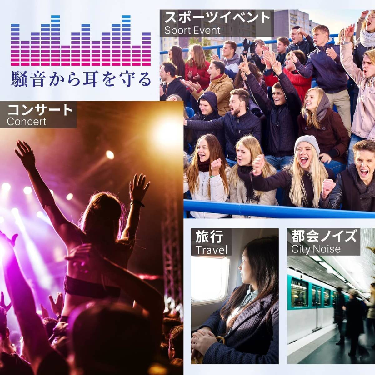 ライブ会場ではもちろん、日常使用でも役立つアイテムです。旅行時の飛行機のエンジン音や現場工事の機械音などのノイズから耳を守ります。そして会社の電話や話し声から離れて仕事や勉強の集中にも最適です。同時に近くにいる人の声が適度に聞こえてくるので装着したまま会話することもOKです。