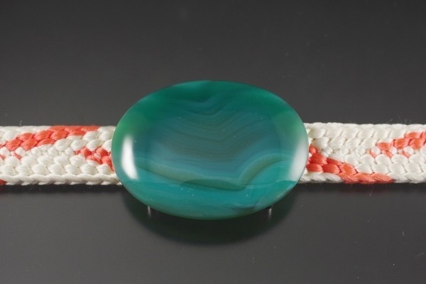 石は緑色がキレイな瑪瑙クリソで、光に透かすと薄っすらと縞模様が浮かび上がります。