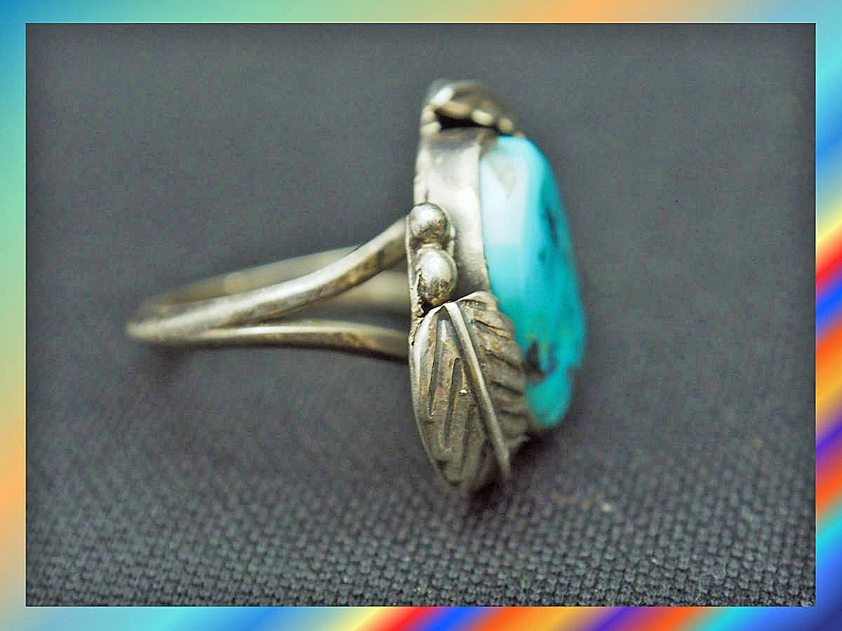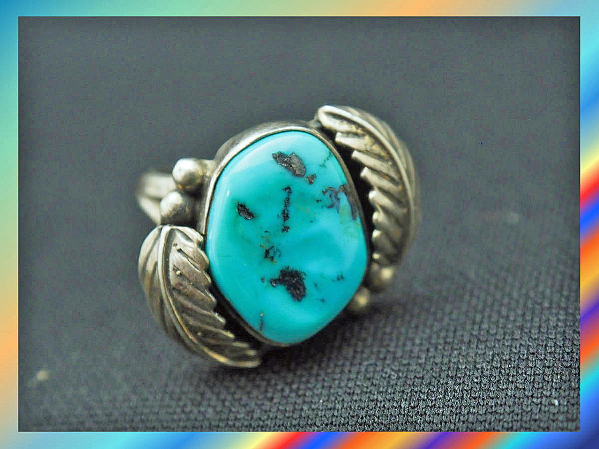 スターリングシルバーを使い、ナバホ族特有の文様を入れ、そのセンターにはキングマン鉱山産出のターコイズを埋め込んだ美しいリングです。