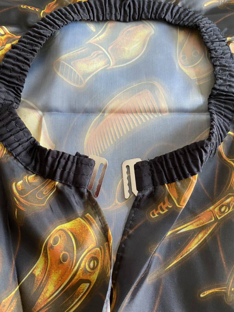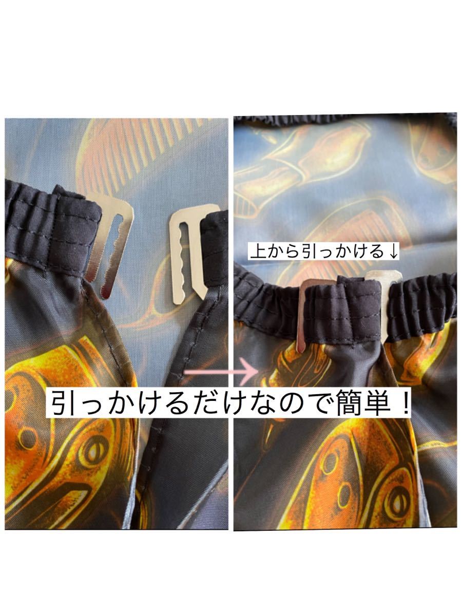 首元はゴム入り。サイズの調整は、マジックテープではなく両側の金具をゴム部に引っかけるタイプの為、おしゃれで衛生的、そして簡単に着用出来ます。(画像5)