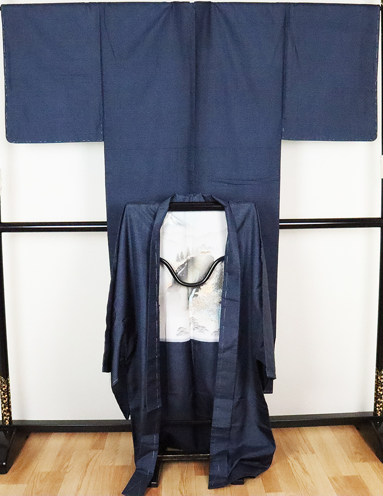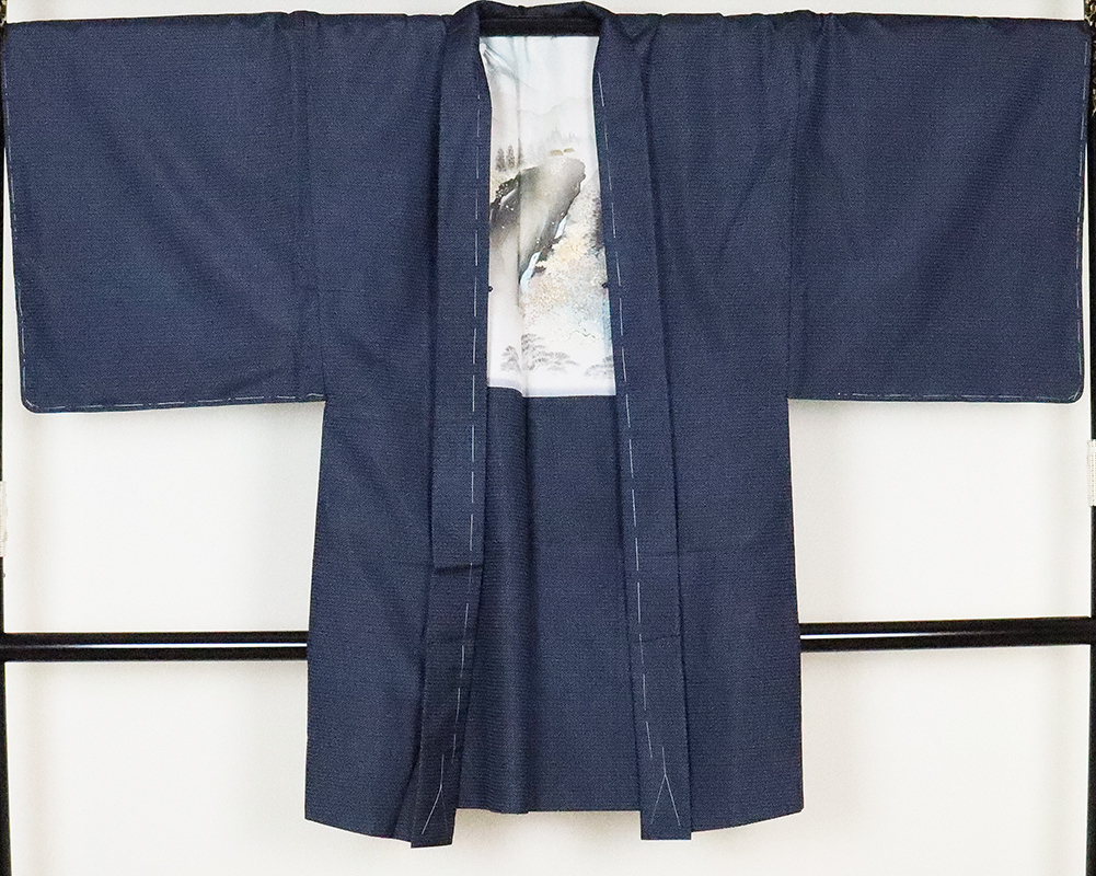 | 大島紬アンサンブル 袷 紺地小亀甲 羽織裏柄 山水画柄 M寸 新品 仕付け付き | |