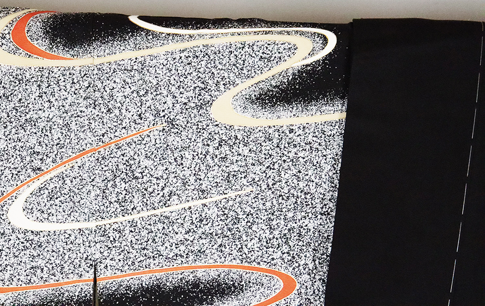 | 訪問着 袷 丹後縮緬 意匠生地とたたき染め地 黒地に白黒たたき染め地流水に渦潮 169 広襟 新品 しつけ付き | |
