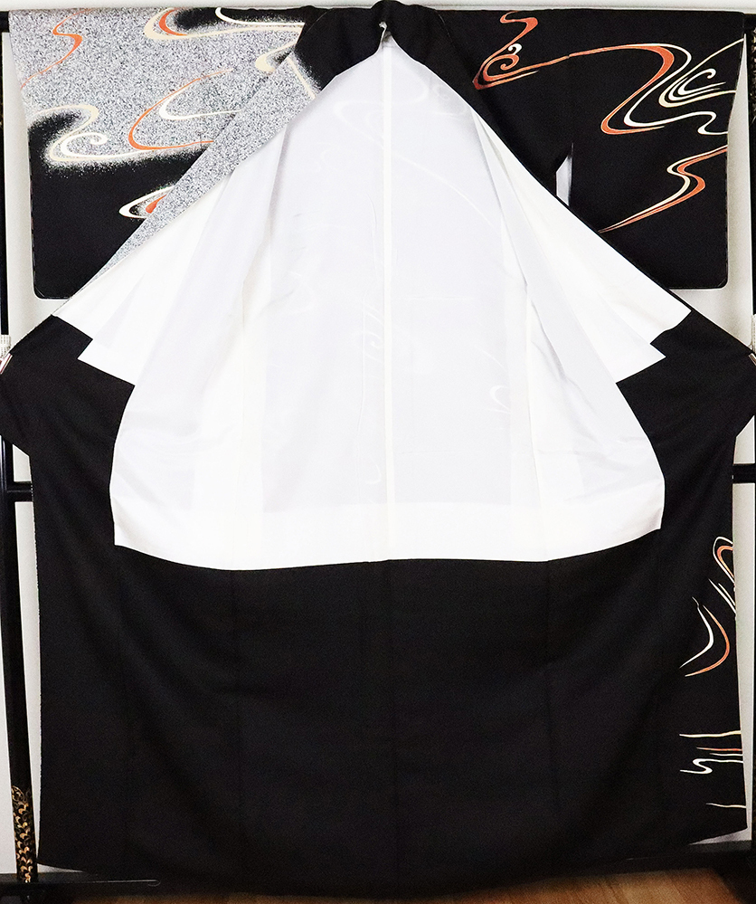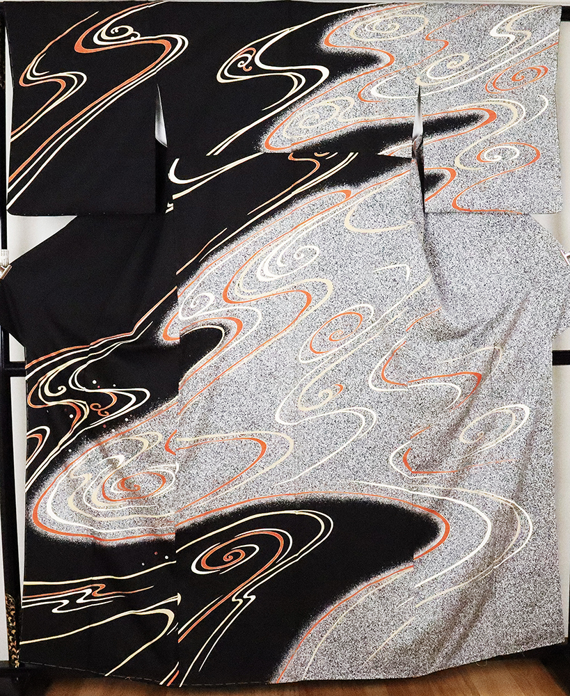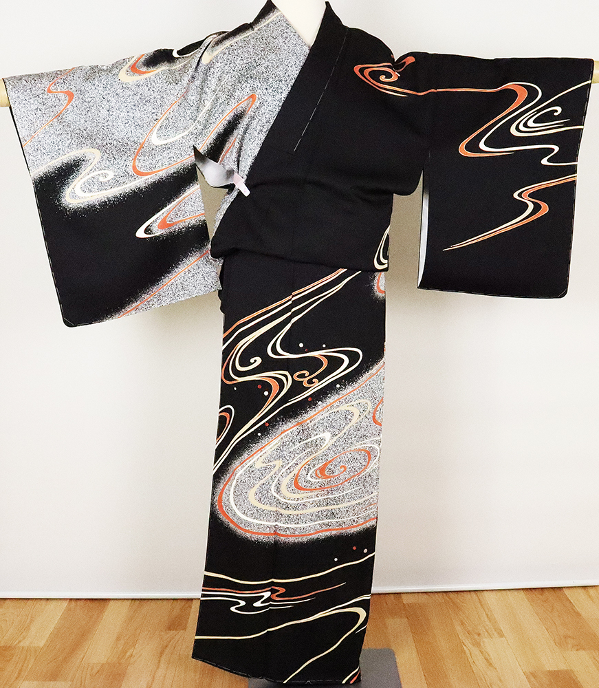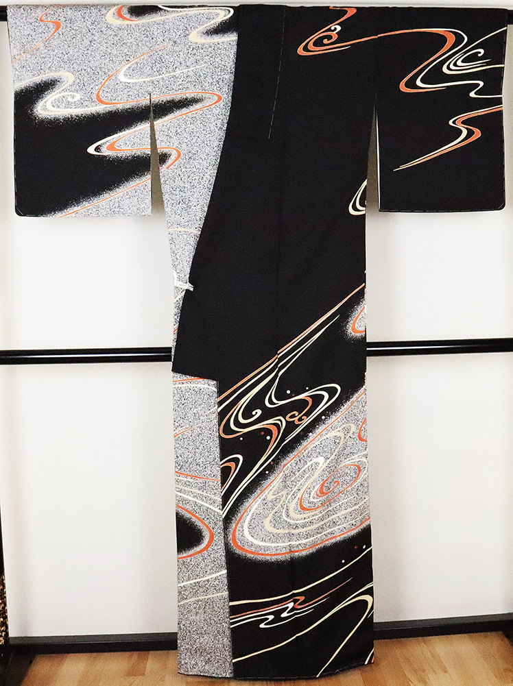 | 色・柄 | 訪問着 袷 丹後縮緬 意匠生地とたたき染め地 黒地に白黒たたき染め地流水に渦潮 (写真では上手く色が出ない場合があります。ご了承下さい) |