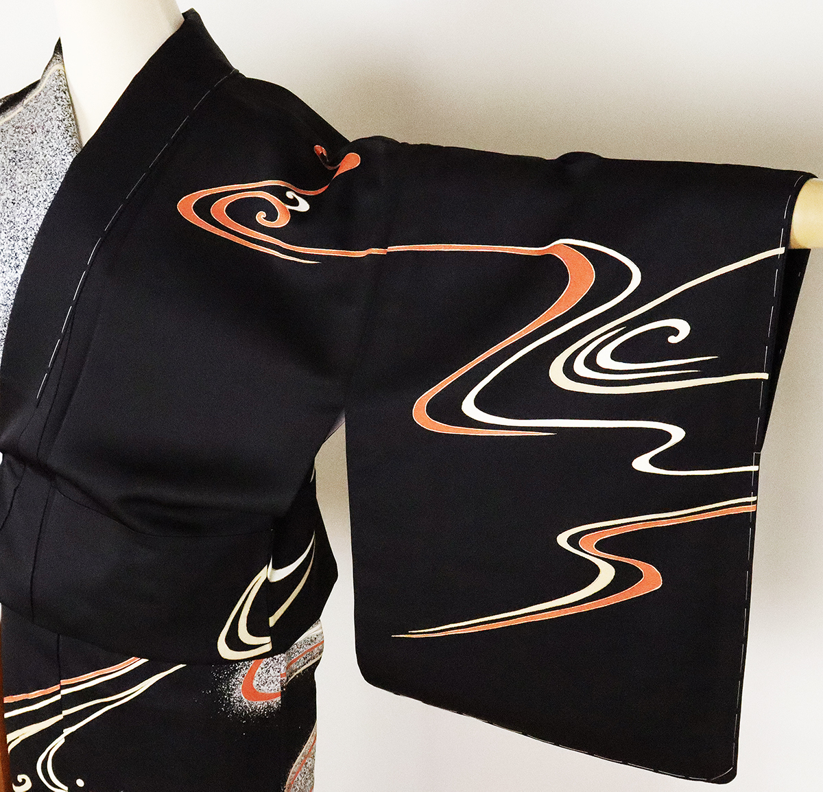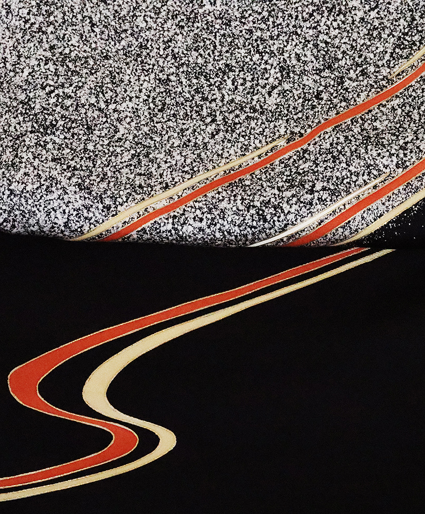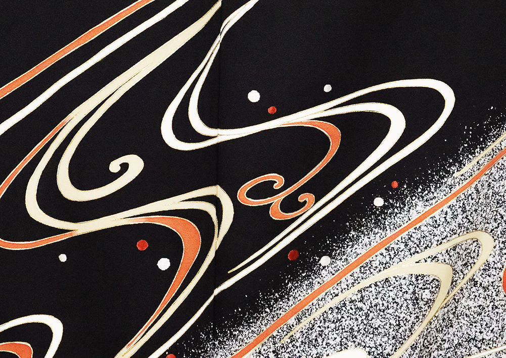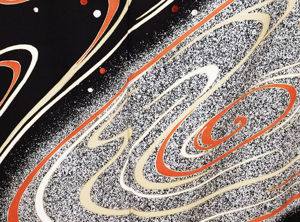 | 色・柄 | 訪問着 袷 丹後縮緬 意匠生地とたたき染め地 黒地に白黒たたき染め地流水に渦潮 (写真では上手く色が出ない場合があります。ご了承下さい) |