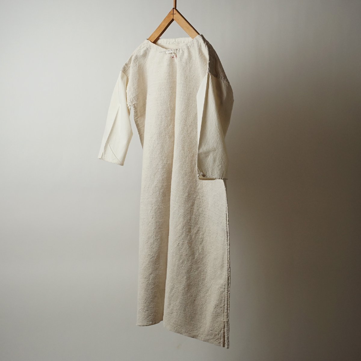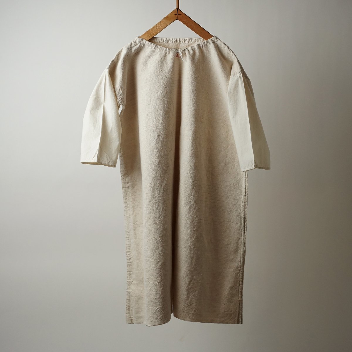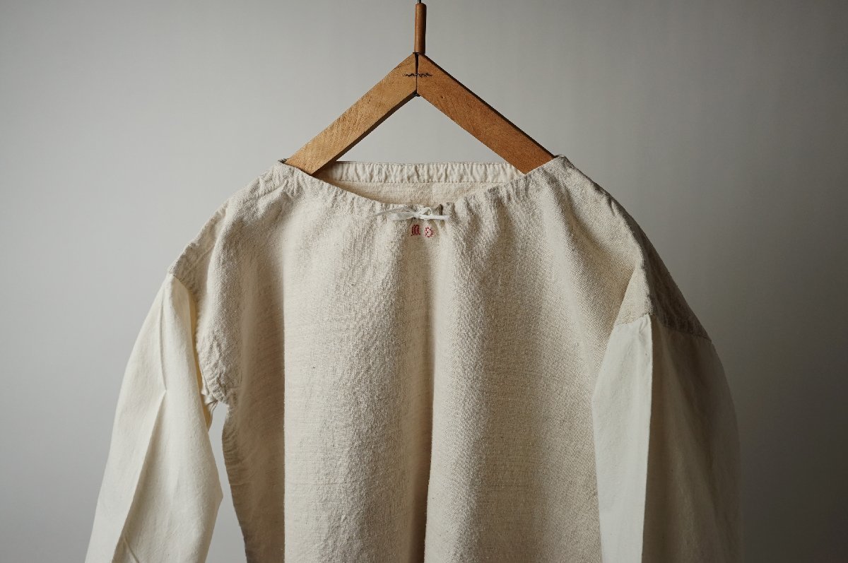 ○素材: フランスアンティーク ワンピースです。しっかりした質感のリネン素材で、袖がコットンです。首周りに紐が通っています。首元に赤い刺繍があります。裾淵は裁ち切り処理になっています。フランス購入品です。