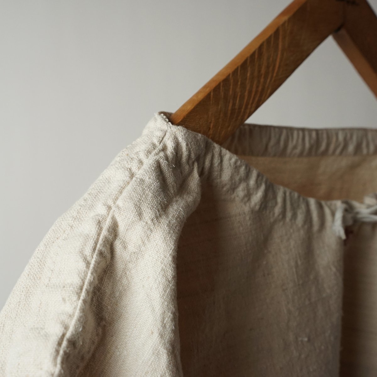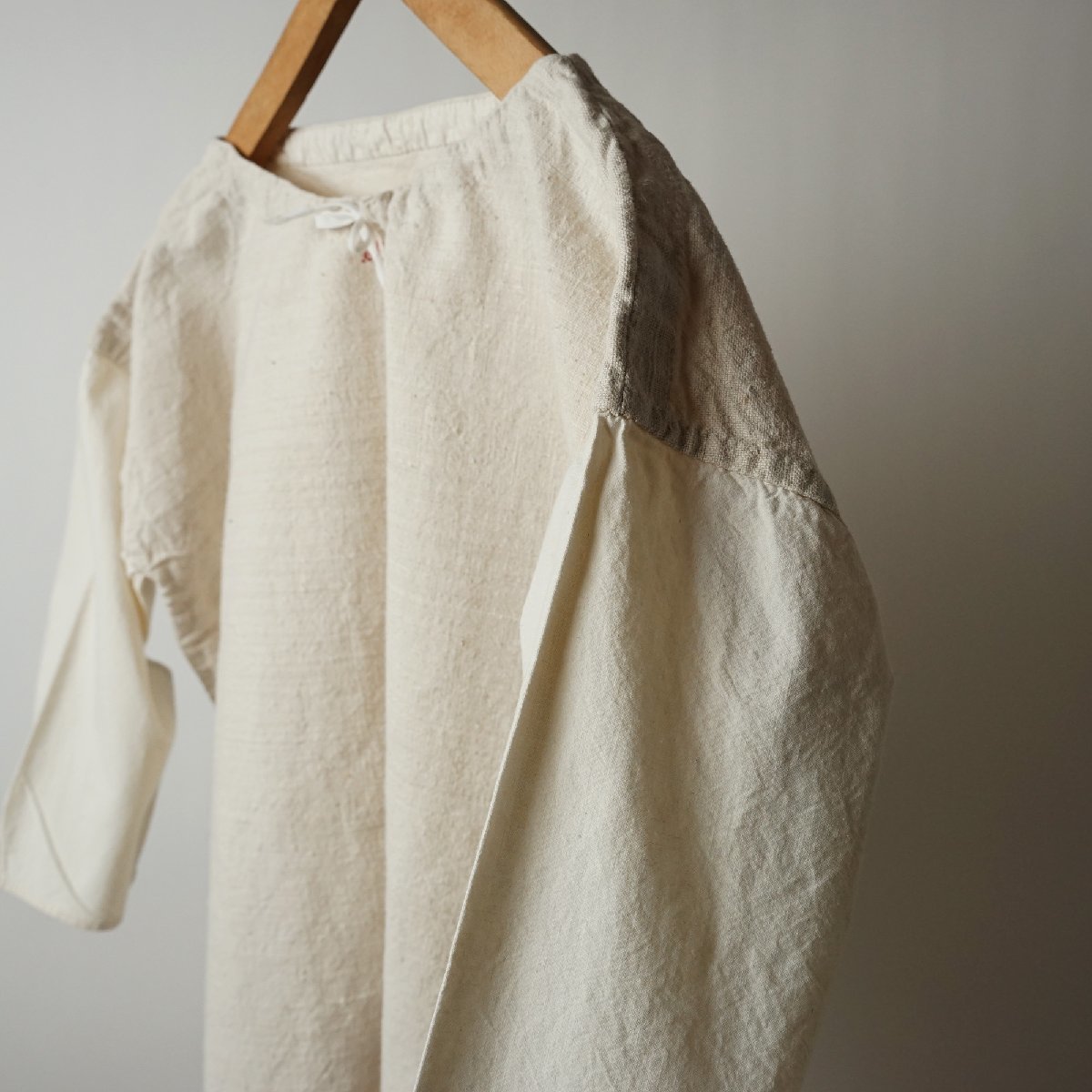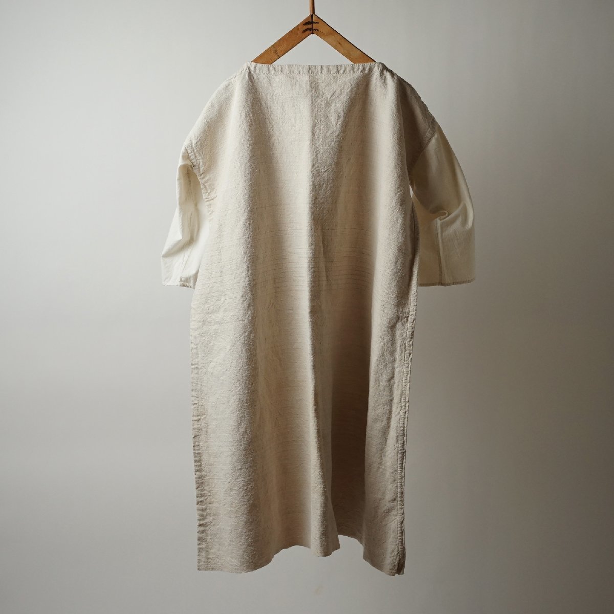 ○素材: フランスアンティーク ワンピースです。しっかりした質感のリネン素材で、袖がコットンです。首周りに紐が通っています。首元に赤い刺繍があります。裾淵は裁ち切り処理になっています。フランス購入品です。