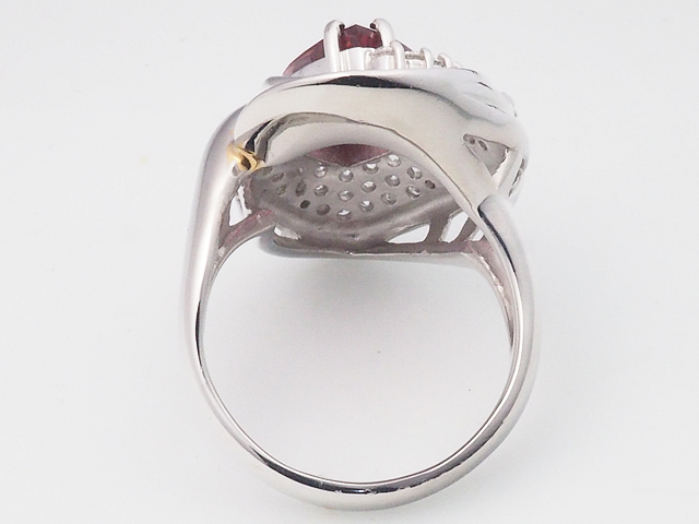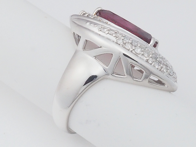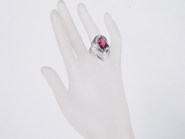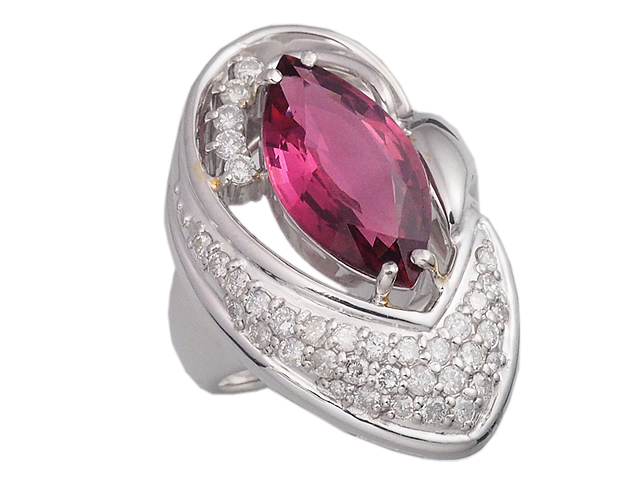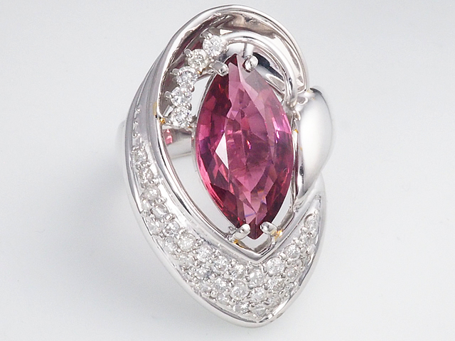 透明感があり、色のしっかりのった美しい5カラットオーバーのピンクトルマリンです。ダイヤモンドで飾り立てた、プラチナ900製のデザインリングです。