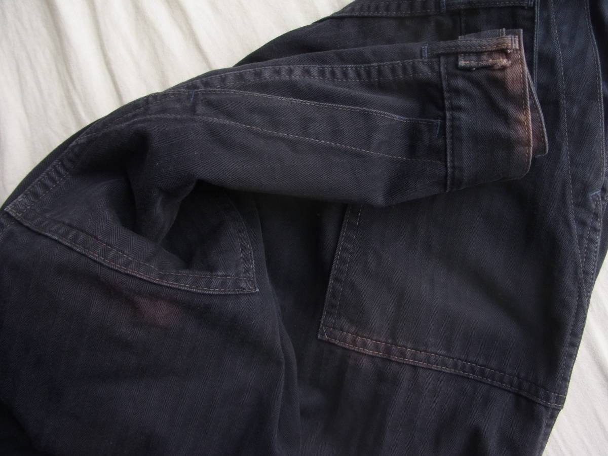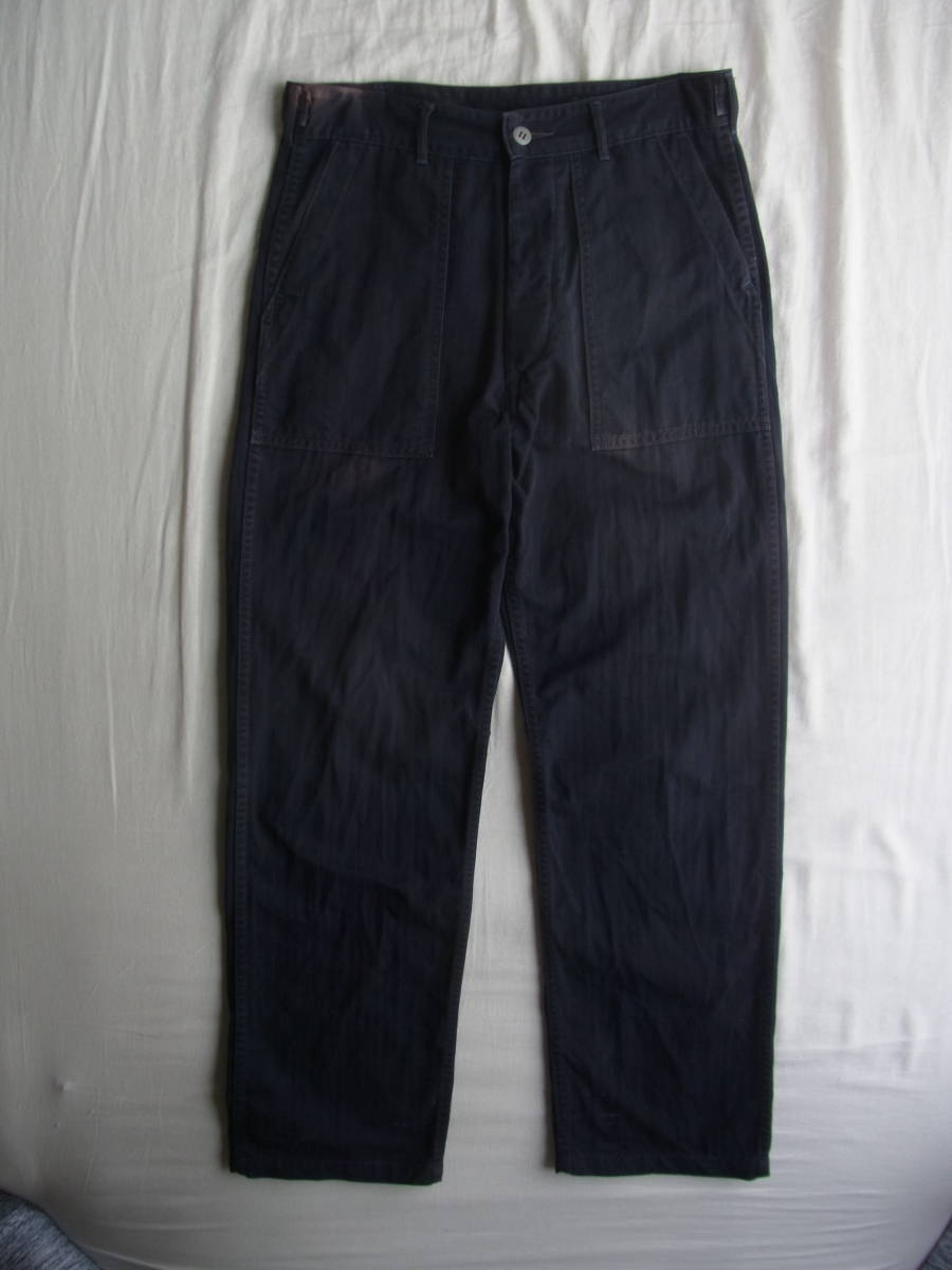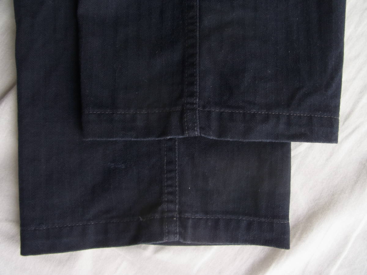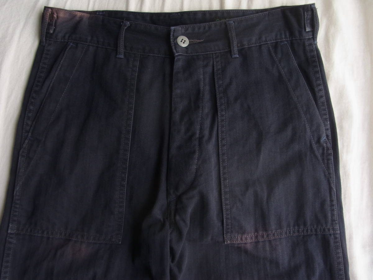 コロナのコットンヘリンボン織柄素材のベイカーパンツになります。USEDで着用感と色褪せ、帯部分と前後ポケットの下側に変色(8~9枚目の画像)、裾部分スレた箇所が御座います。それ以外には特に目立ったダメージ等は御座いません。