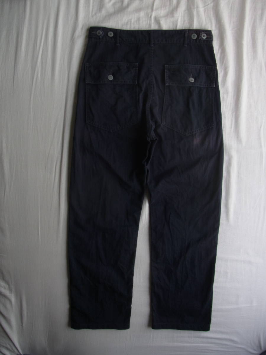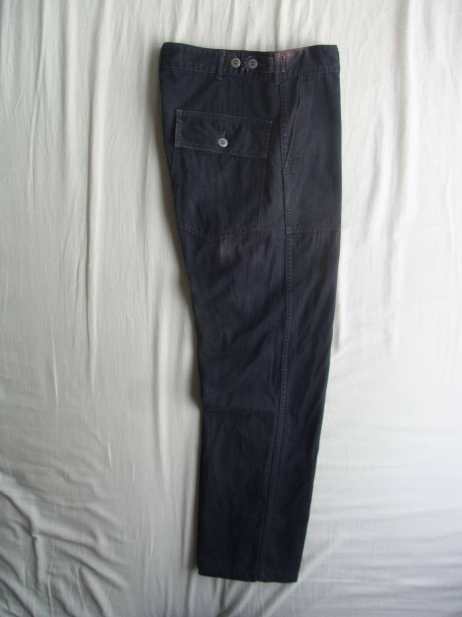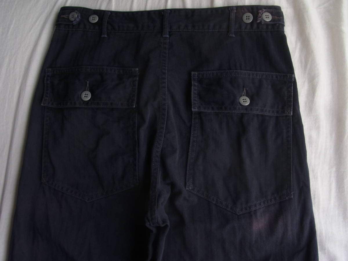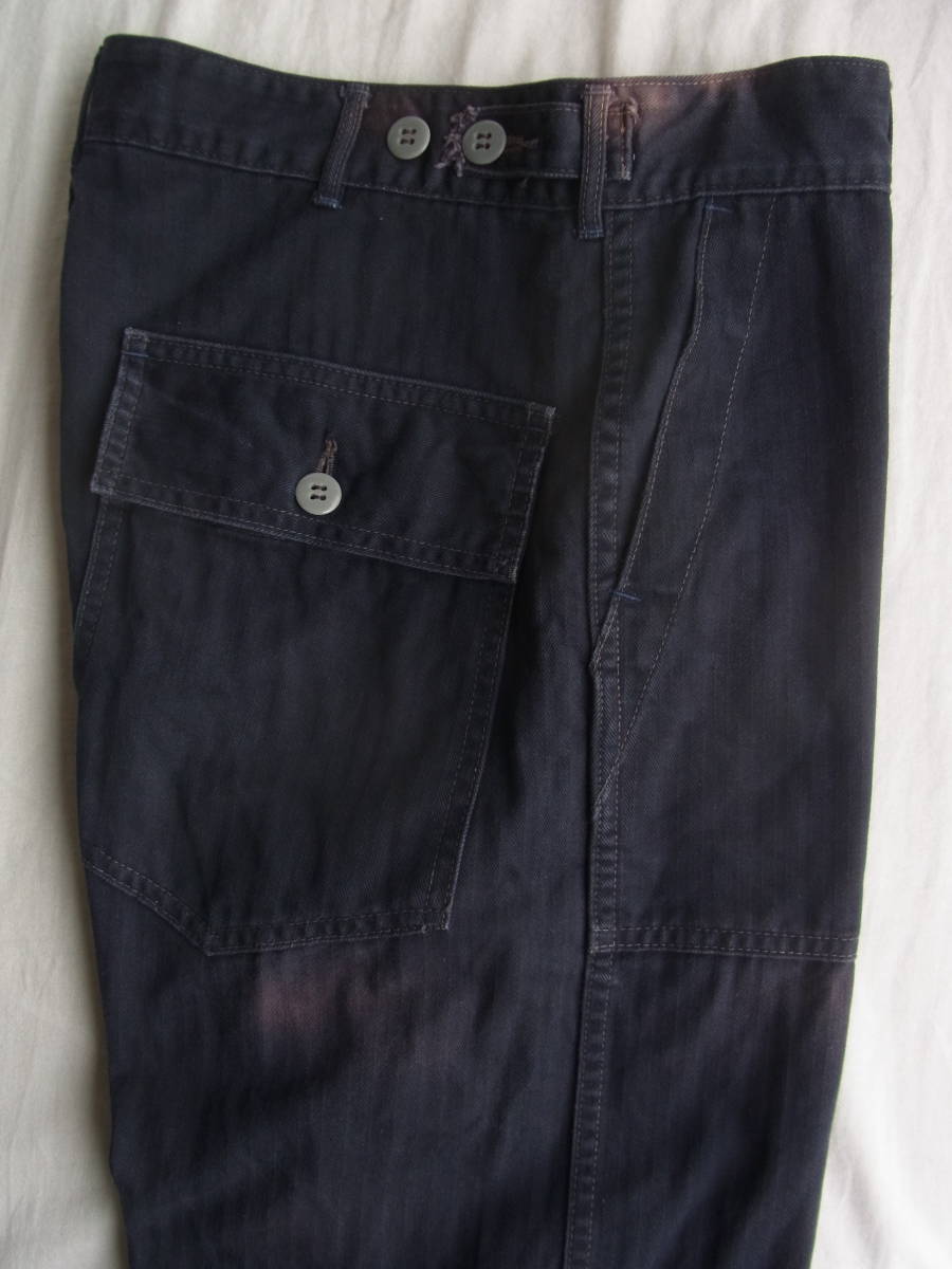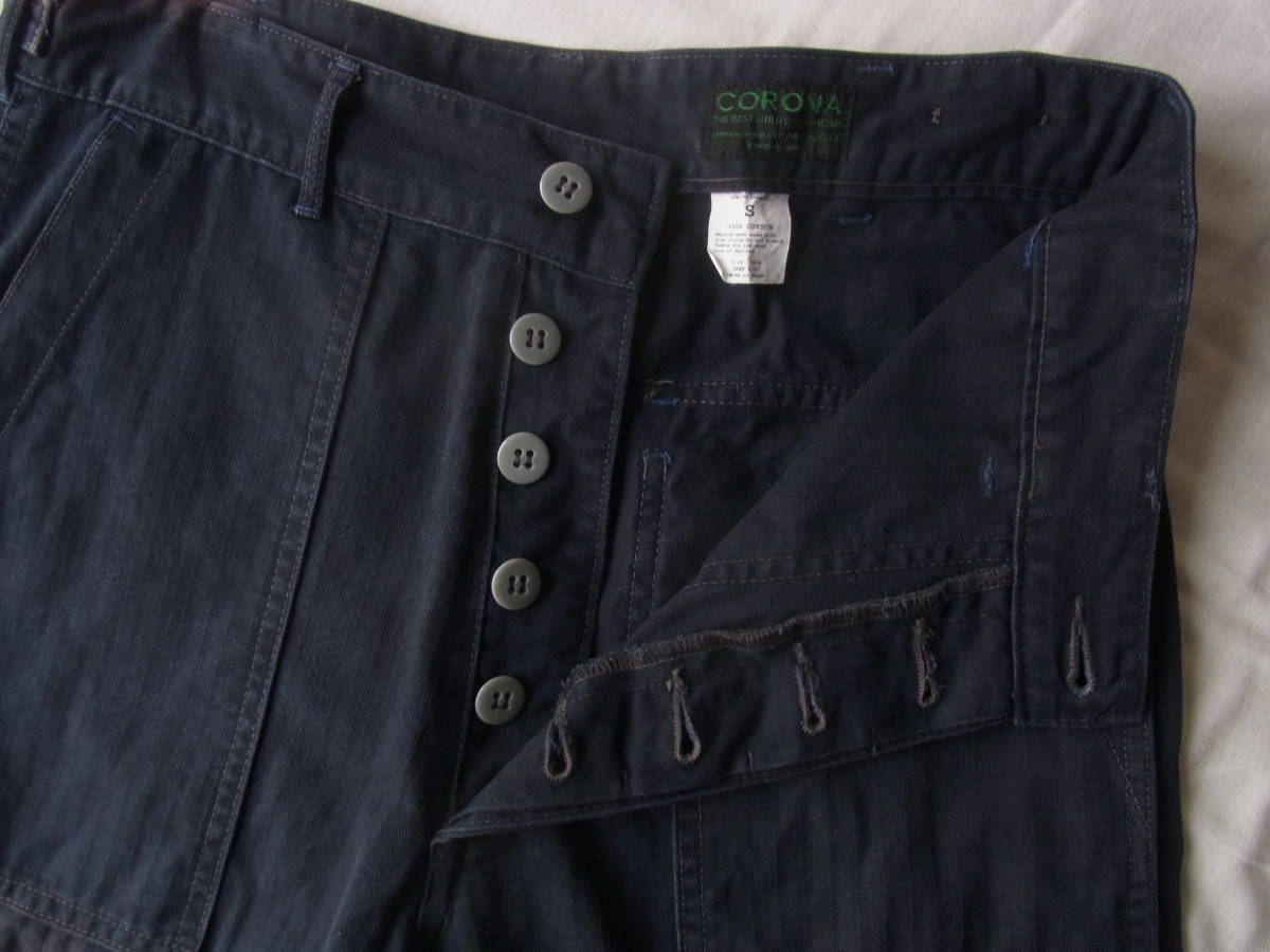 コロナのコットンヘリンボン織柄素材のベイカーパンツになります。USEDで着用感と色褪せ、帯部分と前後ポケットの下側に変色(8~9枚目の画像)、裾部分スレた箇所が御座います。それ以外には特に目立ったダメージ等は御座いません。