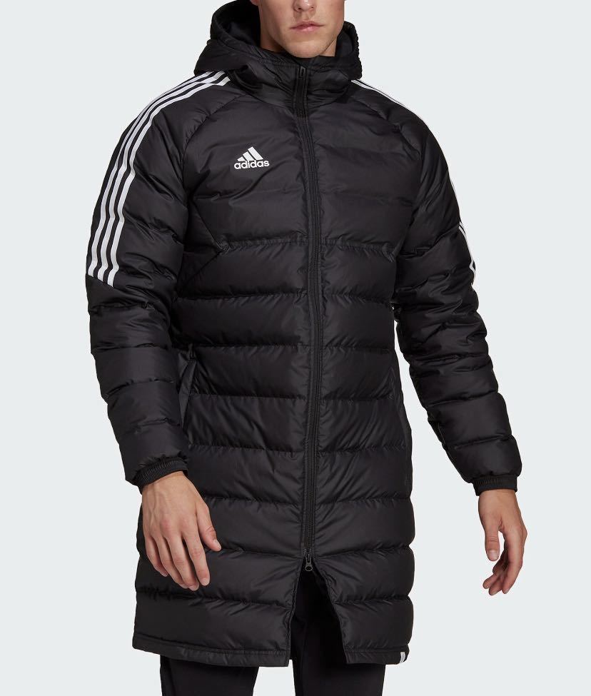 トップレベルのプレーヤーのために作られた、Condivo 22のオフピッチレンジの一つ。サイドラインの外で待つ選手が、身体を冷やさないようにユニフォームの上に羽織るのに適した、ロング丈のジャケット。冷たい風が吹きすさぶ季節でも暖かい、ダックダウンとフェザーが詰まった作りでありながら、シルエットはスリム。急に雨が降ってきても、フリース裏地付きのフードを被れば、ゲームの行方に注視していられる。