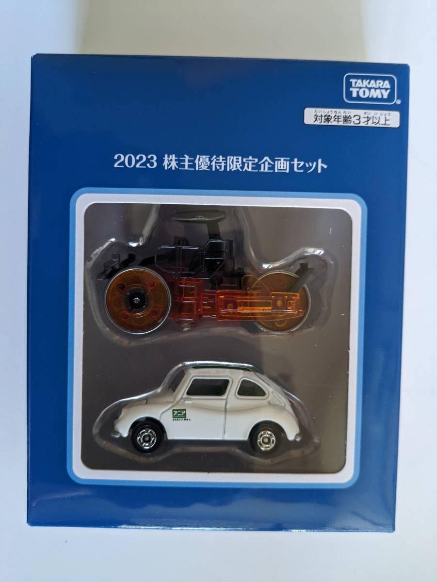 タカラトミーの 株主優待品 2023 の「トミカ2台セット 日立建機 マカダムローラ & スバル 360」です。