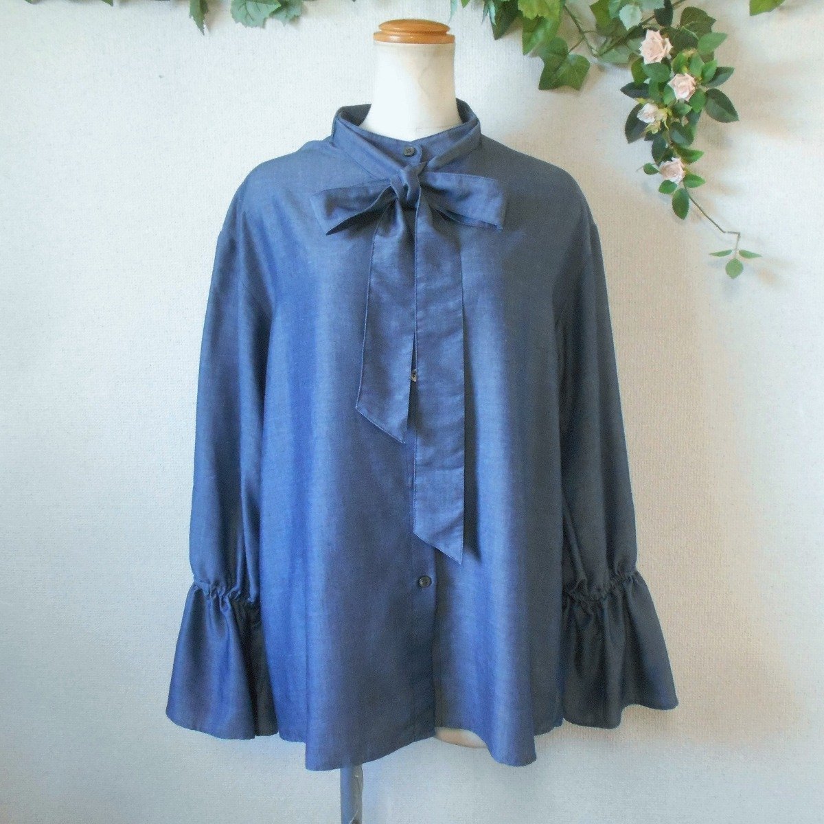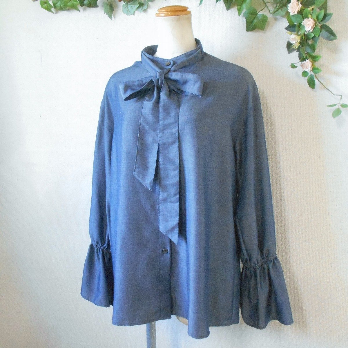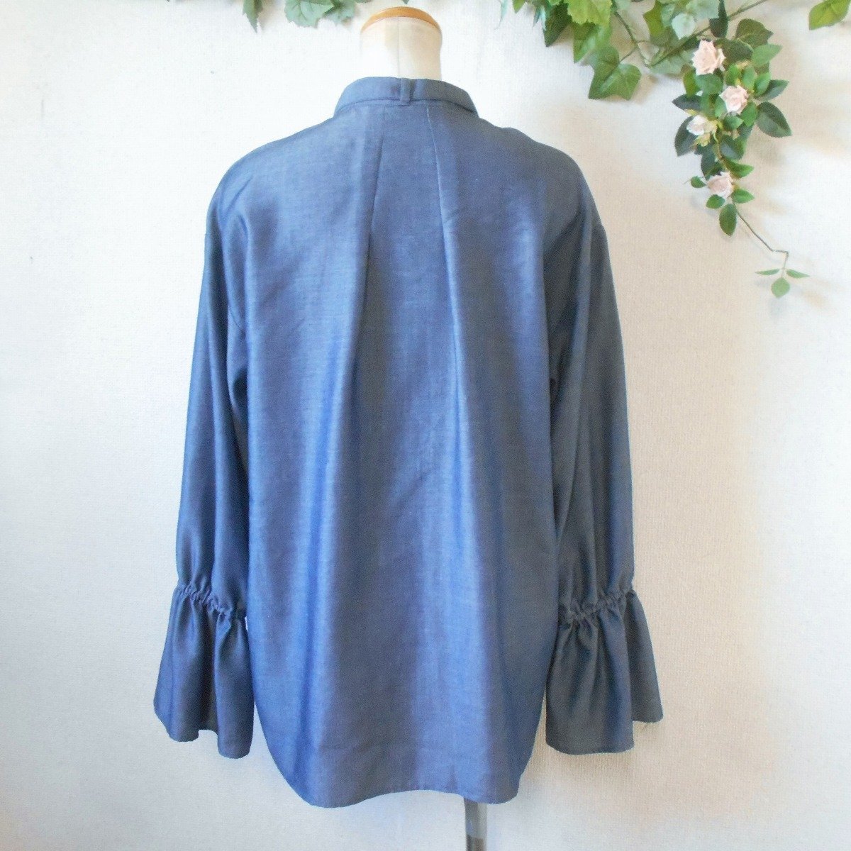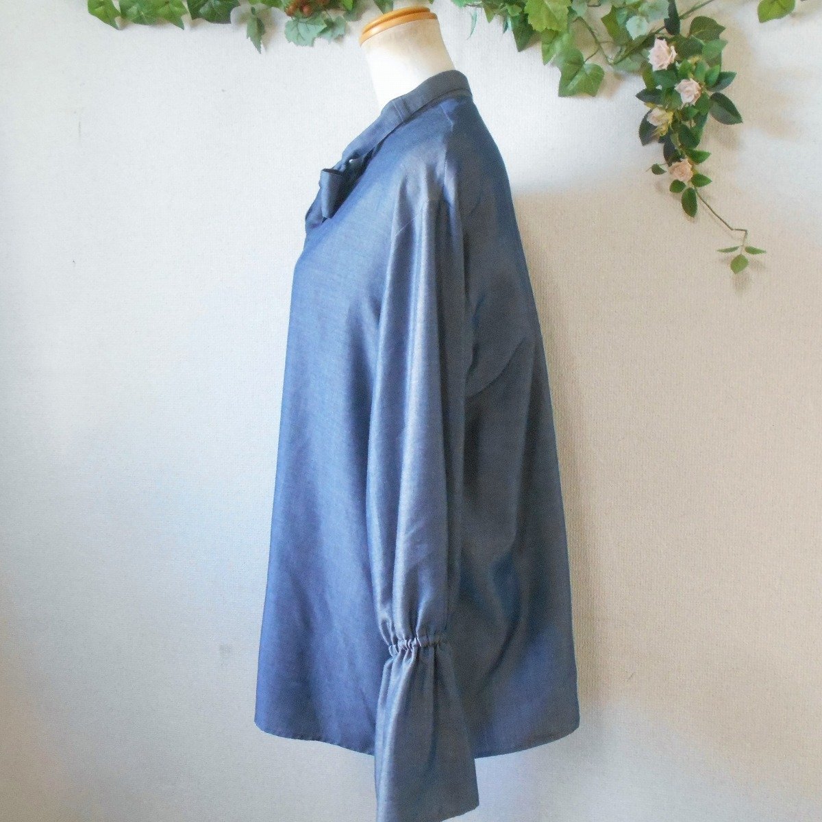 【ポイント】ミランカのレディース用ブラウスになります。お色はブルーグレーといった感じで春や秋を中心に着ていただけるお品です。お袖のデザインがとっても可愛い一着です。