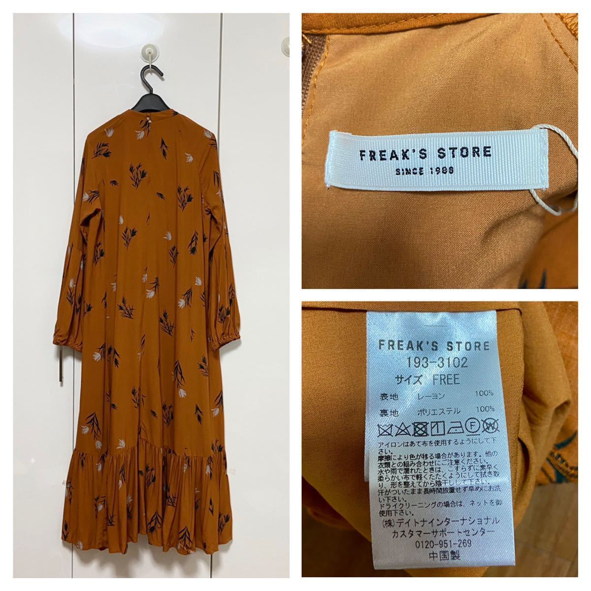 フリークスストアのボタニカル柄レーヨンワンピース、タグ付きの新品です。保管上の汚れやダメージはありませんが、クローゼット保管ですので神経質な方はご遠慮ください。