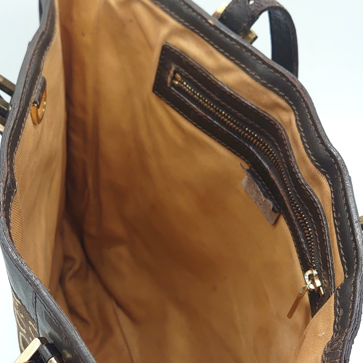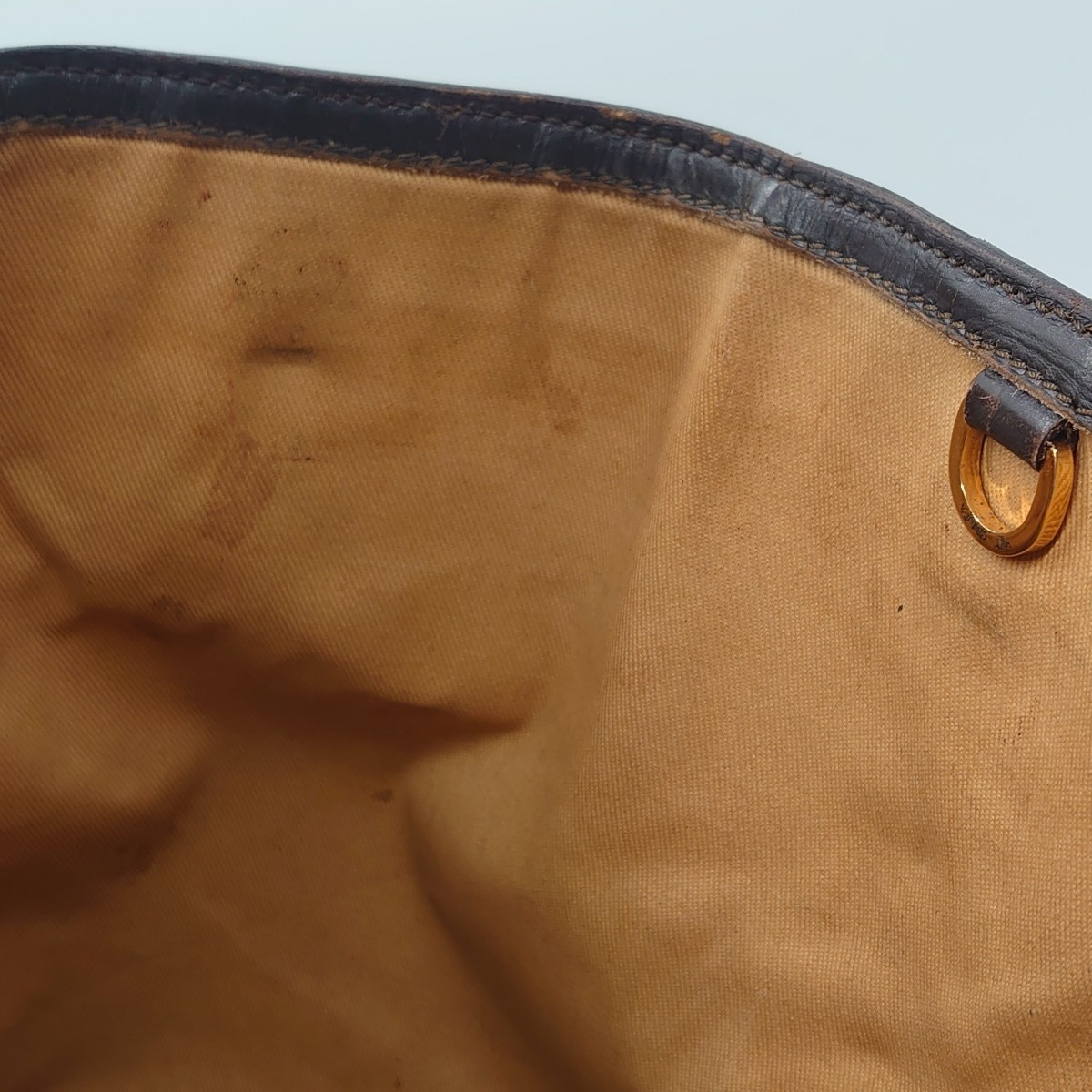 レザー部分のヒビ割れや型崩れ、内側にシミや汚れが見られます。
