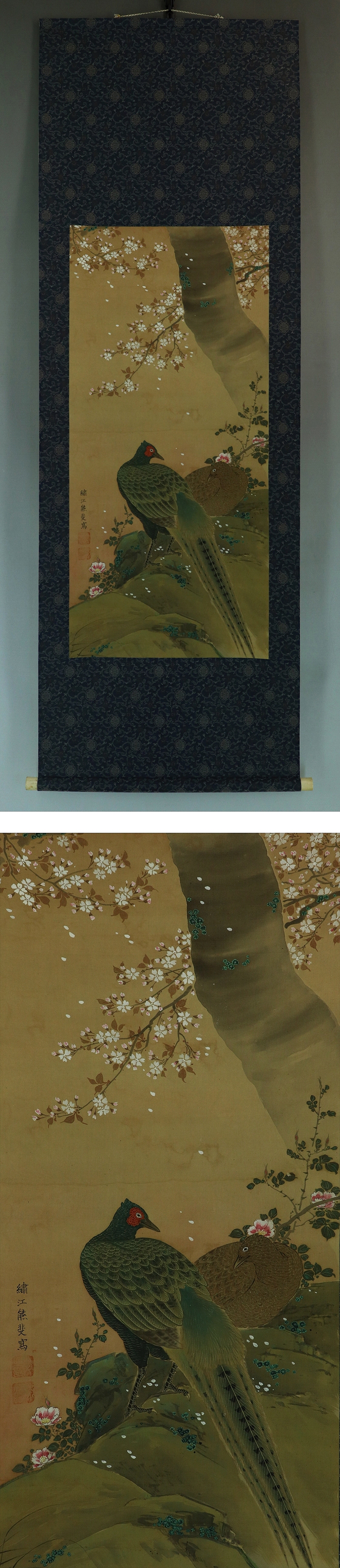 | №2301101【真作】 熊代熊斐 【双雉図】◆絹本◆合箱◆掛軸 | |