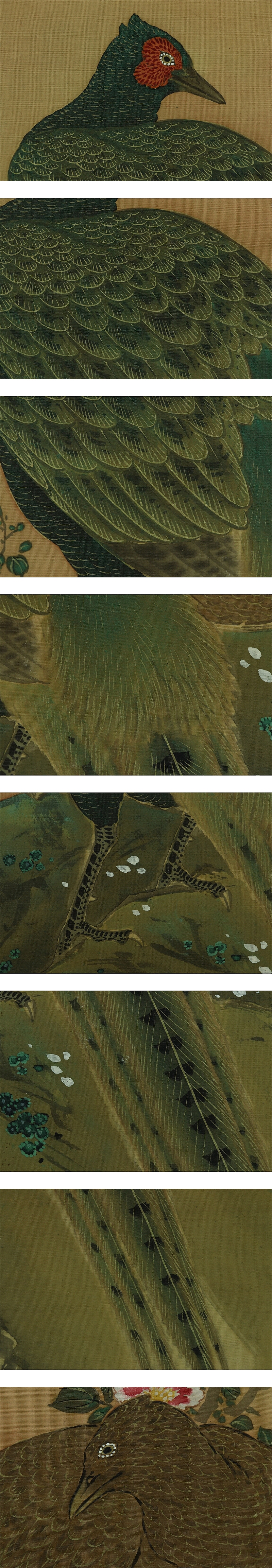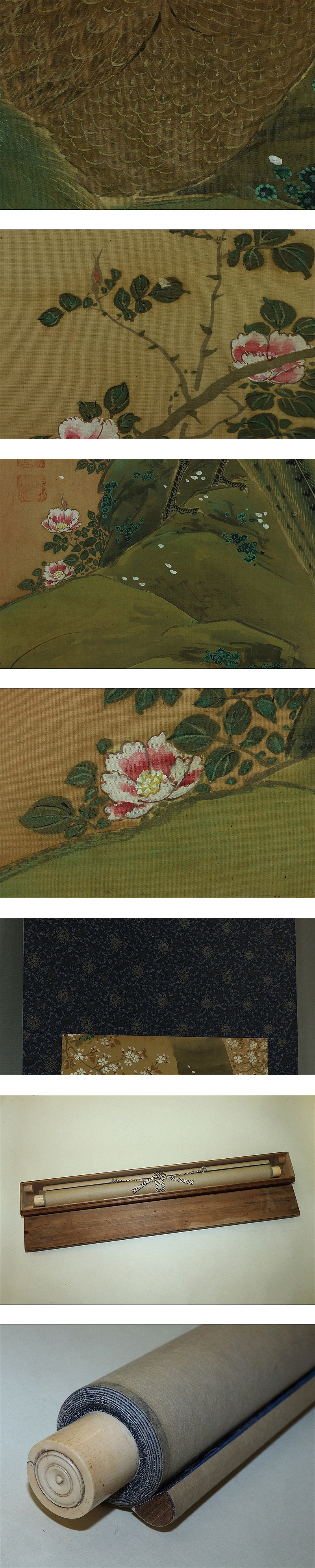 熊代熊斐 くましろ-ゆうひ(1693-1773) 江戸時代中期の画家。元禄(げんろく)6年生まれ。肥前(ひぜん)長崎の人。 唐(とう)通事の神代(くましろ)家の養子。 享保16年来日した清(中国)の沈南蘋(しん-なんぴん)にまなび,南蘋流写生花鳥画の先駆けとなる。 姓名を熊代斐にあらため,中国風にちぢめ熊斐と称した。安永元年12月28日死去。80歳。 字は淇瞻(きせん)。号は繍江(しゅうこう)。 本紙は、染みがあります。 表装は、軽い染み、軸先汚れとひびがあります。 【サイズ】 作品 横約40.5cm×縦約88cm 表装 横約53cm×縦約158cm |