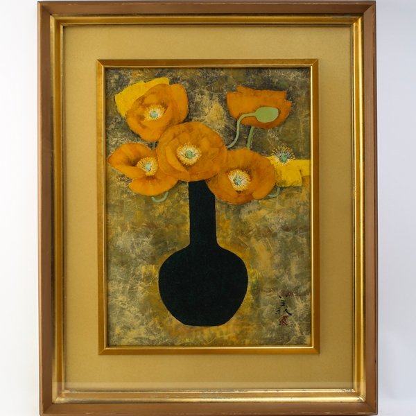 石川義 ポピー 黄色い花 日本画 8号 落款 静物画 日展評議員 金沢学院大学名誉教授 額装 #32666