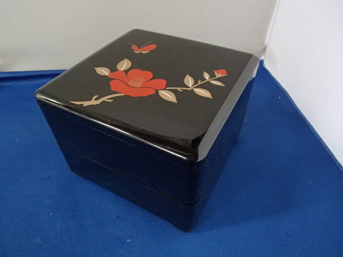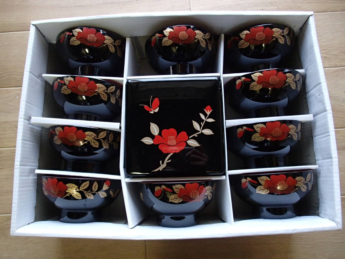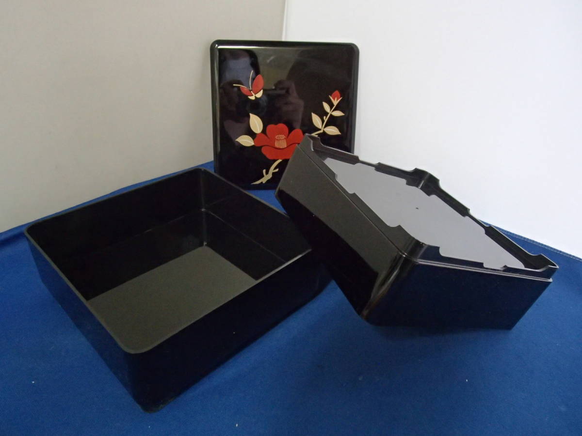 素材:ABS樹脂 塗装:ウレタン塗装<未使用> ●御碗口径11.4cm 底径5.8cm 高さ6.0cm 高台1.5cm 41g/個 ●重箱13.3×13.3cm 高さ 4.8cm/個