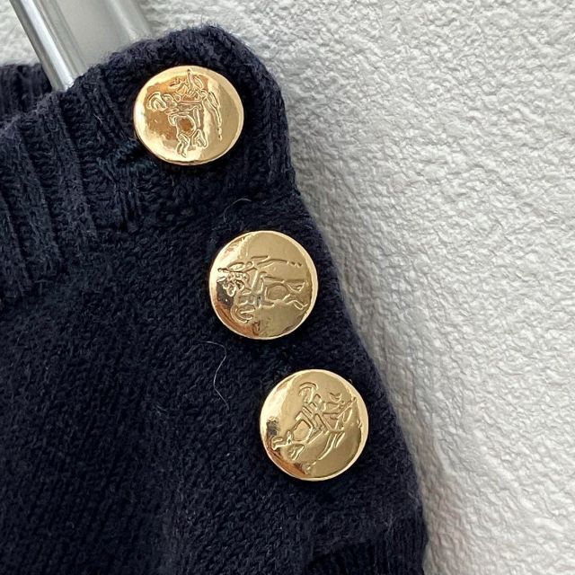 胸元にはホースマーク刺繍の入ったワッペン・左肩には金ボタンのついた一目でバーバリーとわかるデザインです。
