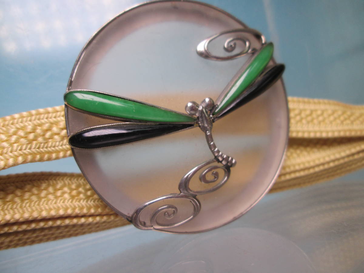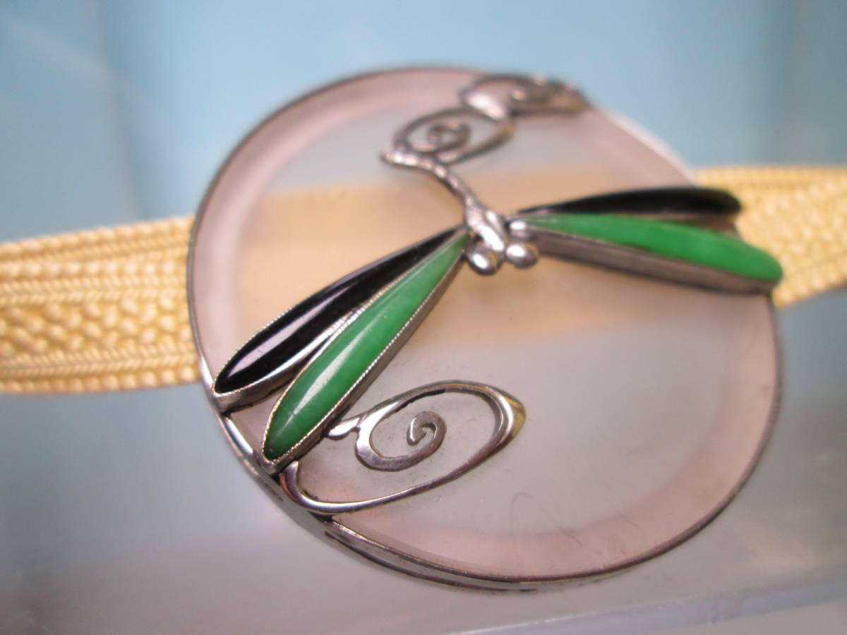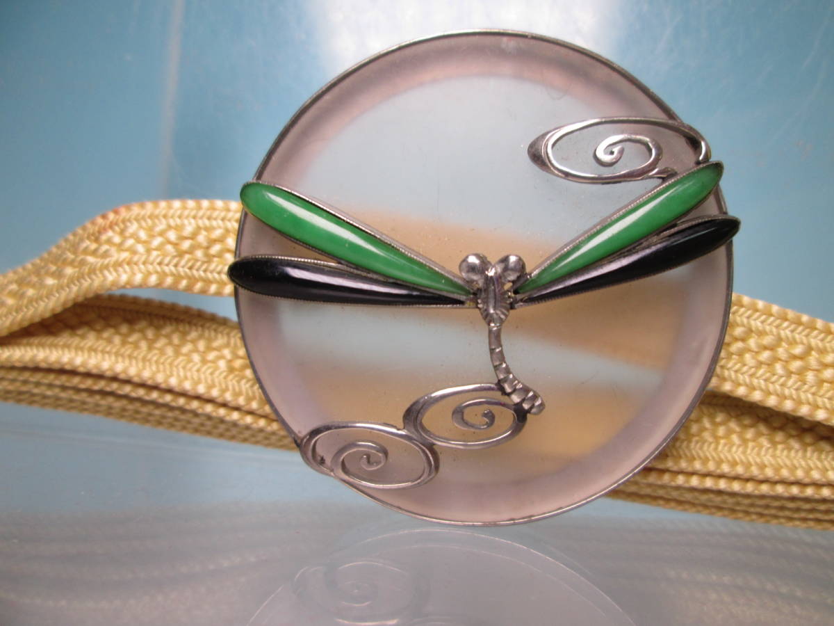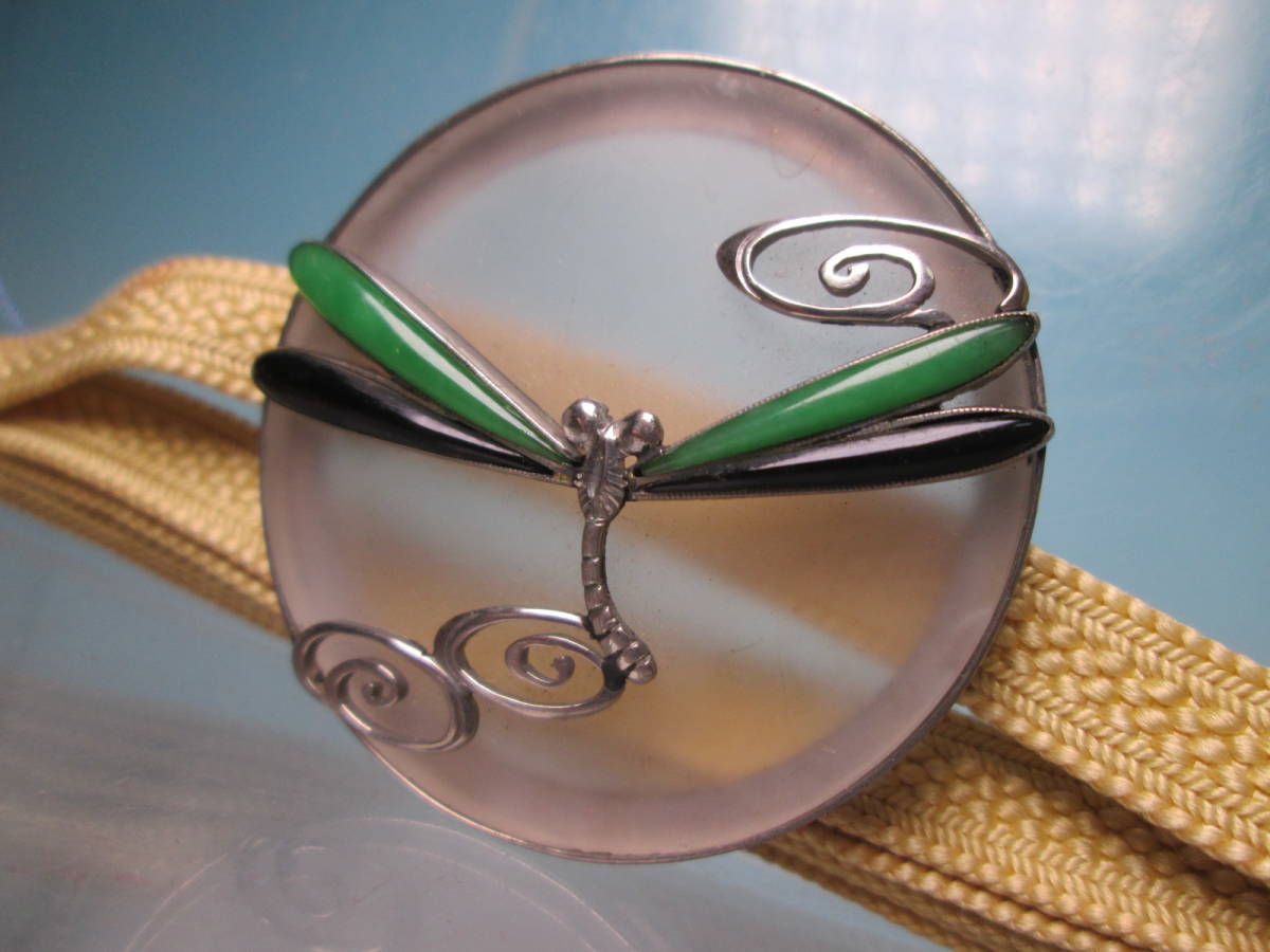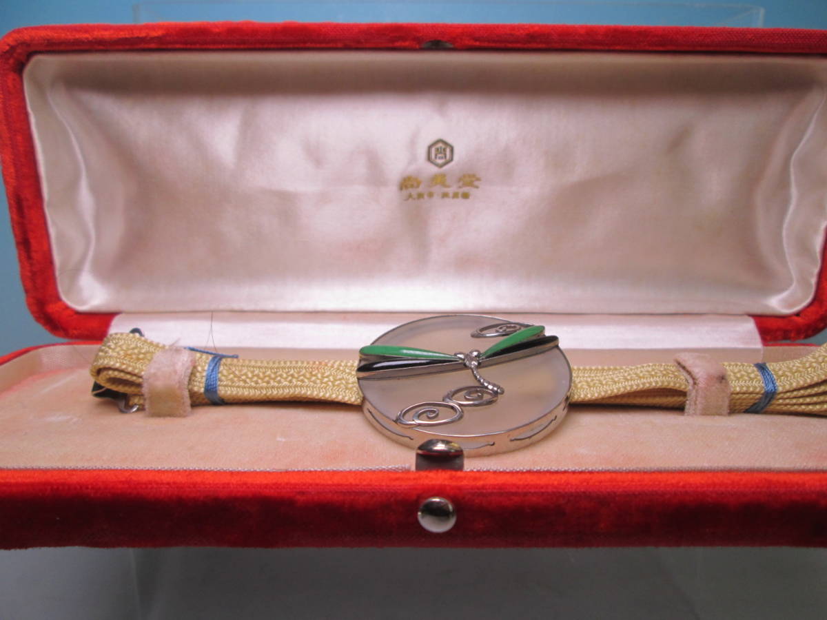 【江月】アンティーク・尚美堂 彫金細工 摺り硝子 涼やかな流水に蜻蛉の帯留め 共ケース付