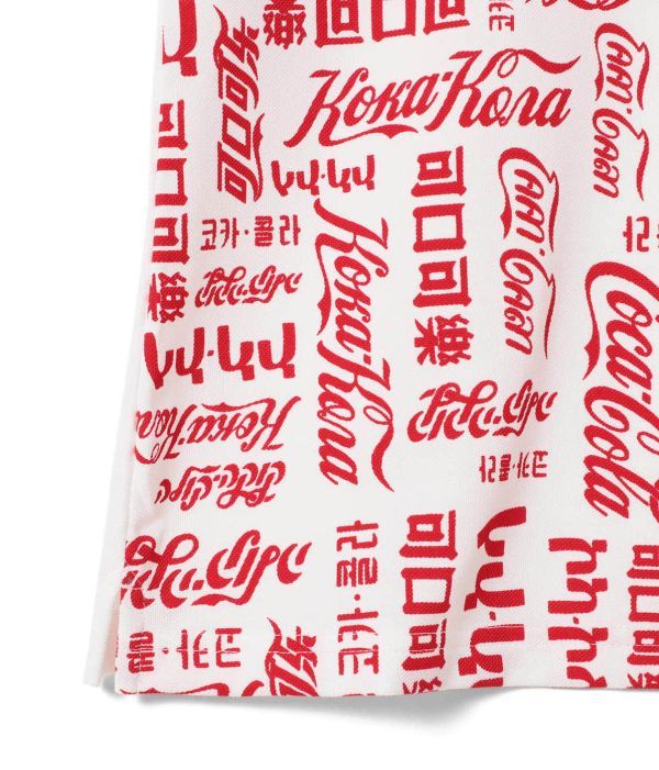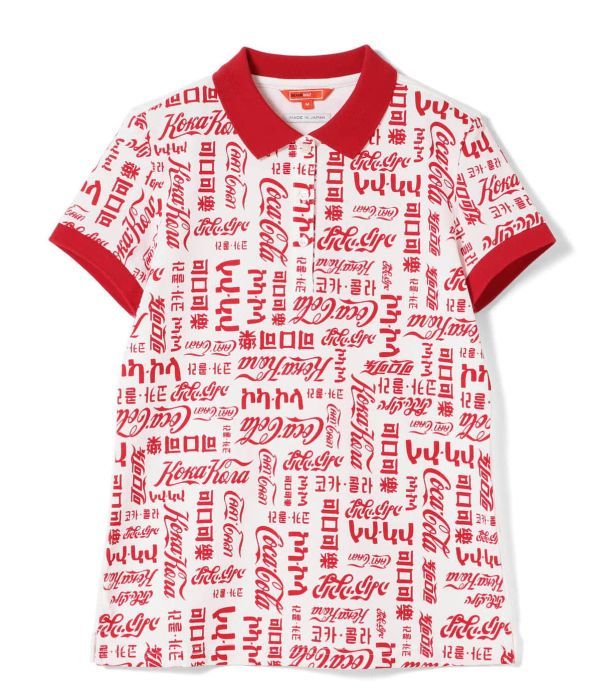 複数の言語で描いた〈COCA-COLA(コカ・コーラ)〉のロゴを総柄にしてプリントしたポロシャツ。後身頃のみ無地にし、すっきりとした印象に仕上げました。