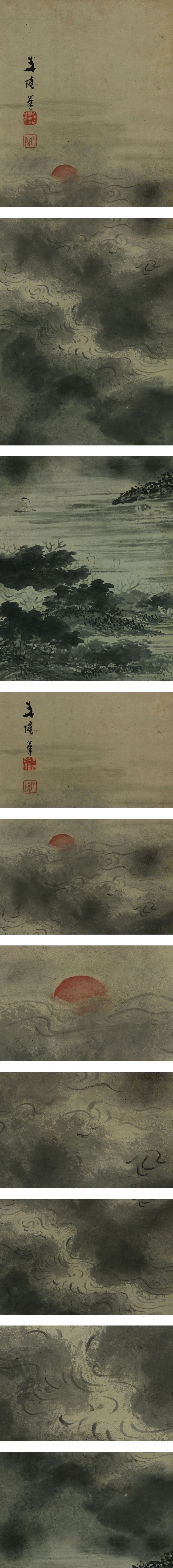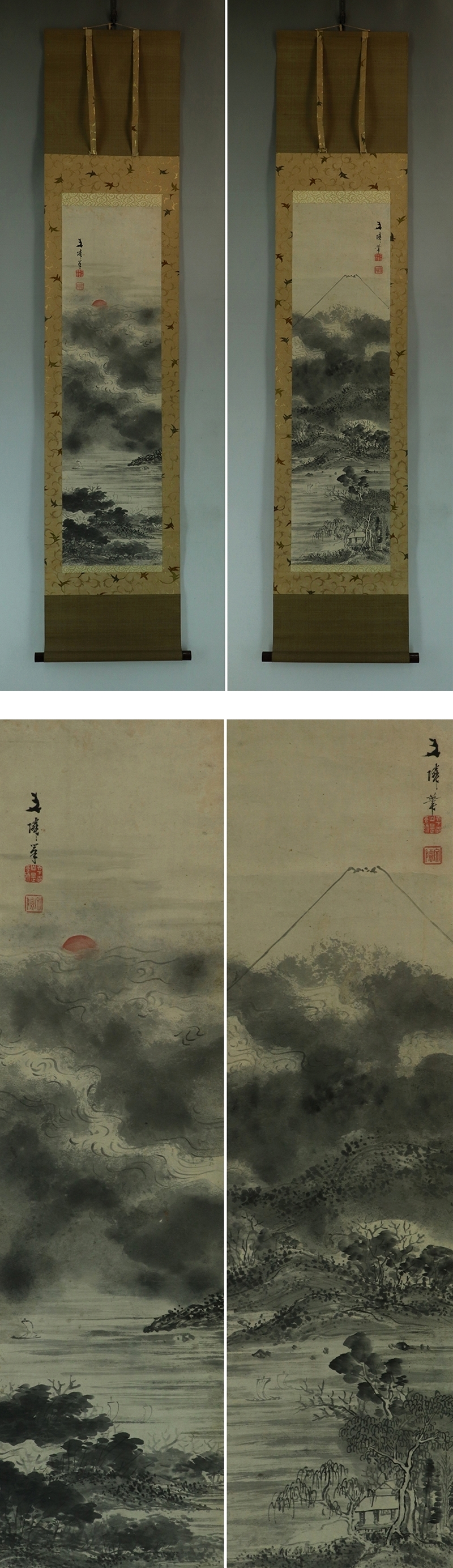 | №2212073【真作】塩川文麟【双幅・日の出・富嶽図】◆紙本◆竹屋町表具◆合箱◆掛軸 | |