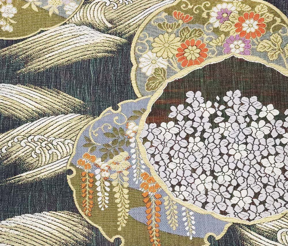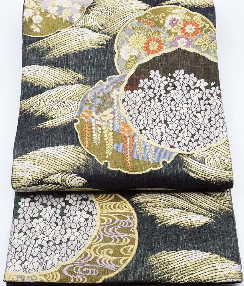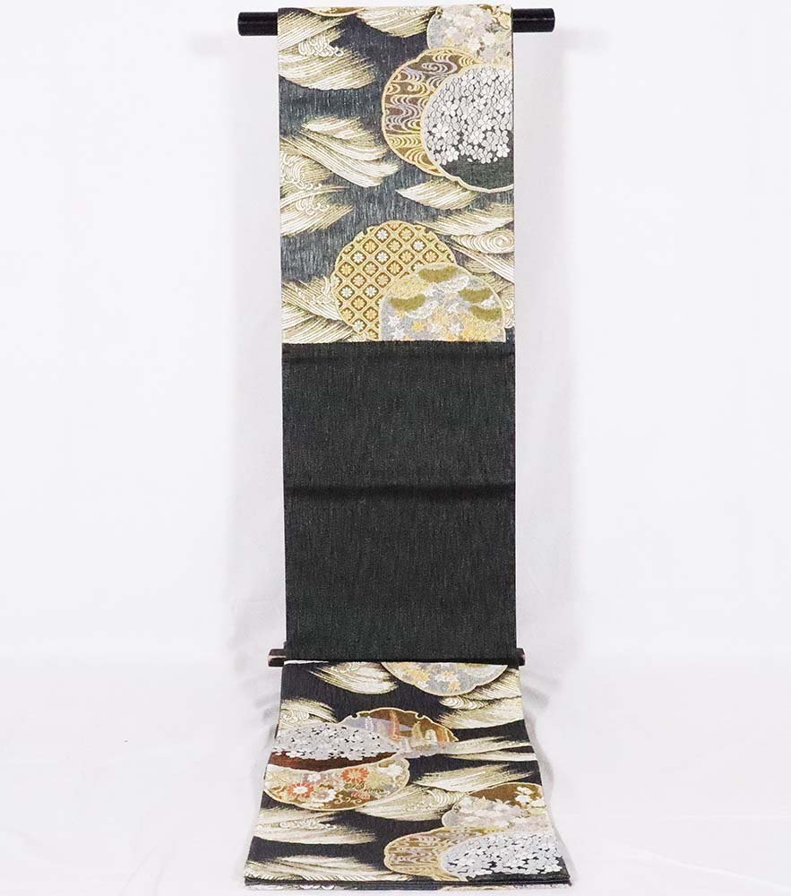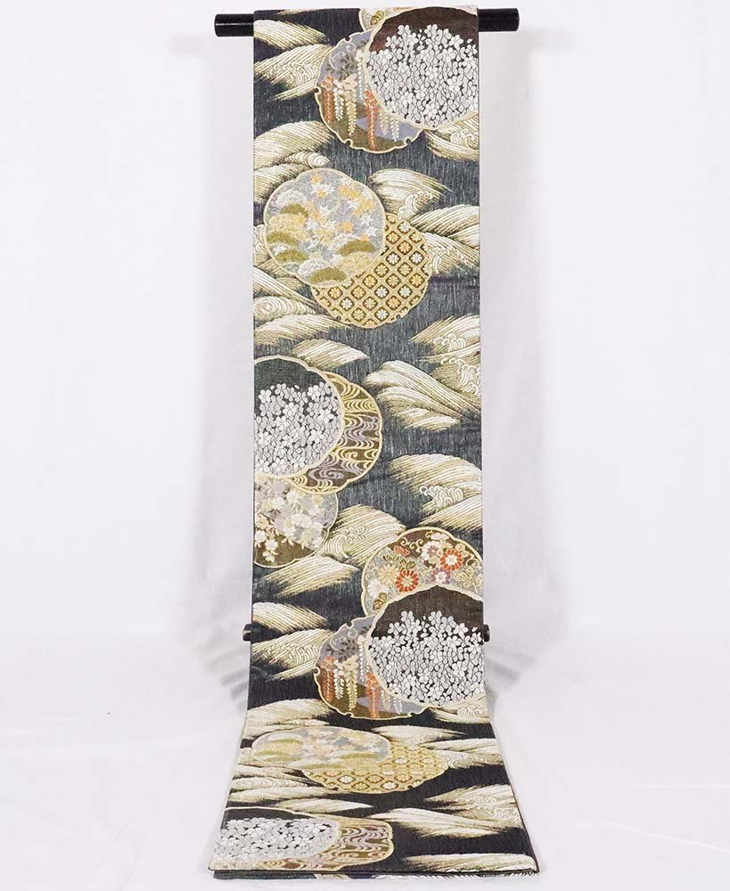 | 西陣織袋帯 櫛織 黒・金地松竹梅・菊・藤・雪輪文 仕立て上がり | |
