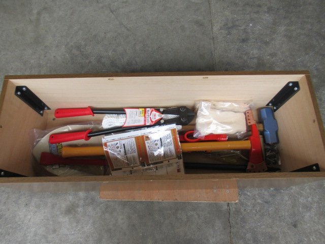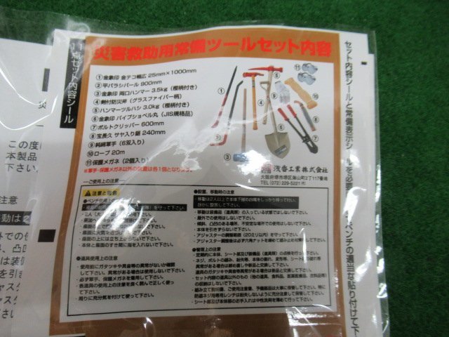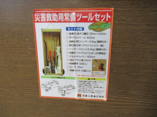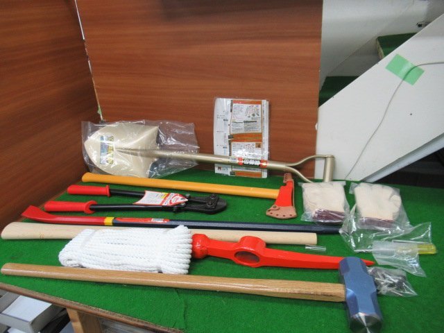 下記の住所で直接引き渡し・現物確認可能です。 ◆住所:千葉県成田市吉倉14-2 寄楽屋本店◆ こちらの商品は沖縄・一部離島への配送は不可になりますのでご了承くださいますようお願い申し上げます。 【商品名】災害救助用常備ツールセット 【メーカー】浅香工業 【型式】ベンチ収納型 【セット内容】 ・金象印 金テコ幅広 25mm×1000mm ・平バラシバール・・・欠品 ・金象印 両口ハンマー 3.5kg(樫柄付き) ・剣付防災斧(グラスファイバー柄) ・ハンマーツルハシ 3.0kg(樫柄付き) ・金象印 パイプショベル丸(JIS規格品) ・ボルトクリッパー 600mm ・宝長久 サヤ入り鋸 240mm・・・欠品 ・純綿軍手(6双入り) ・ロープ 20m ・保護メガネ(2個入り)・・・欠品 全8点になります。 ・寸法(長さL×奥行D×高さH)(mm)(外寸):1140×440×400 ・質量(kg):約45 未使用品になります。 ※初期不良などがない商品になる為、商品の都合上ノークレームノーリターンにてお願い致します。 ※実作業での長時間の使用は行っておりません。 未使用品になりますが欠品があるので「未使用に近い」としています。ベンチが組立済みですので細かな汚れやキズ等がございますのでベンチに関しては汚れ等はあるものとお考え頂けますようお願い致します。 画像の物が全てになります。 他に付属品等はございません。 上記の事をご理解・ご了承の上で ご入札をお願い致します。 その他ご不明な点等ございましたら、ご入札前にお気軽にご質問下さい。 ※17時以降にお問い合わせ頂いたご質問等につきましては、お応えするのが翌営業時間中になりますのでご了承ください。 ※オークション終了日当日のご質問は、17時迄にお願い致します。 *詳細につきまして ご質問されましても お答えできない場合もございます。 | ||||
