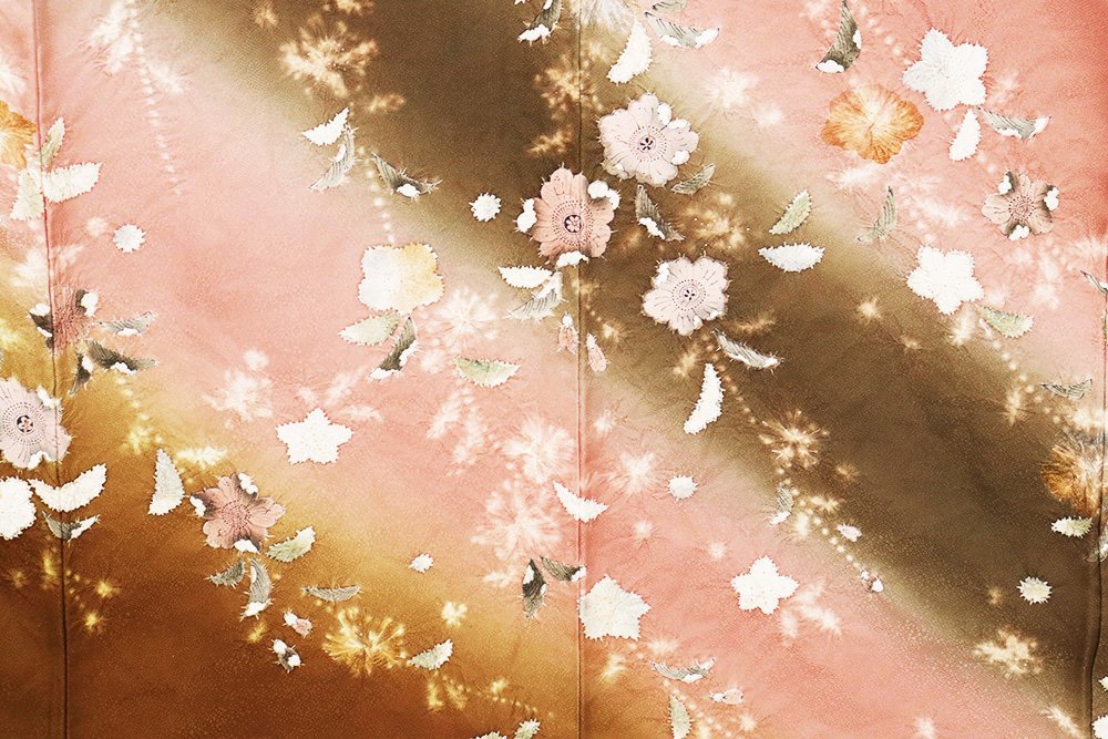 | 辻が花訪問着 袷 丹後縮緬地 緑・薄赤紫・茶色暈し地 絞り辻が花 166 広襟 | |