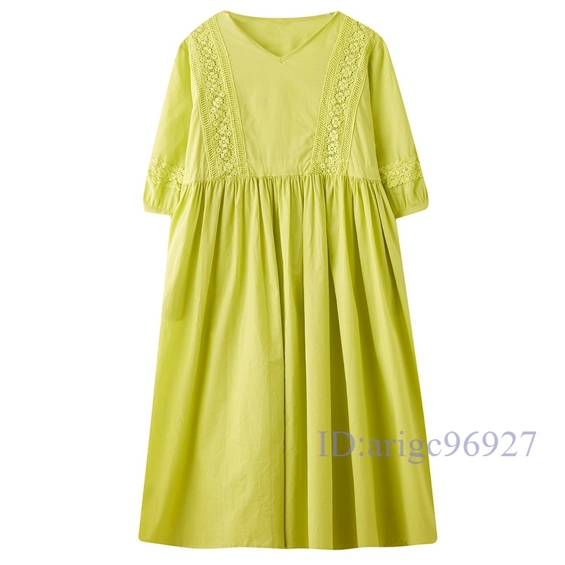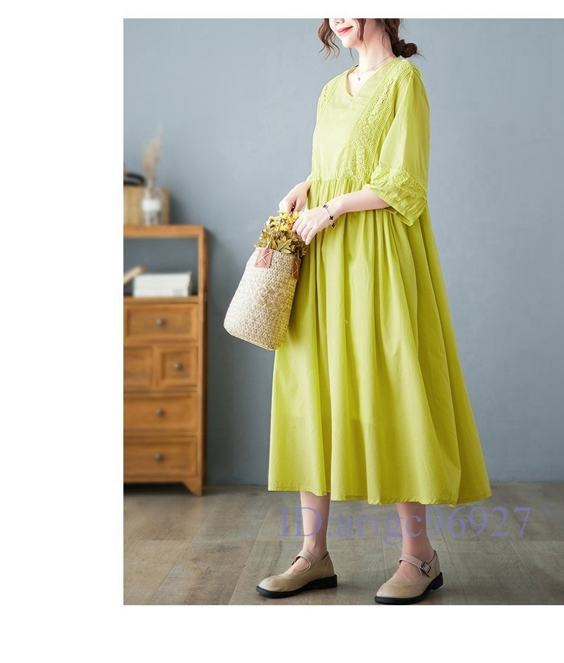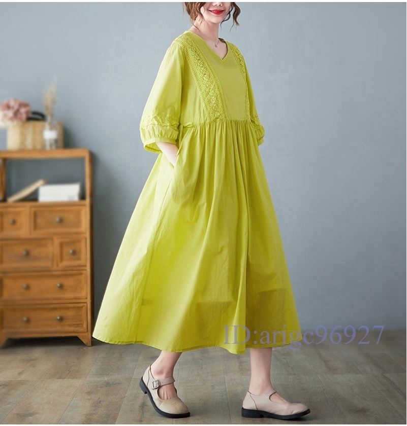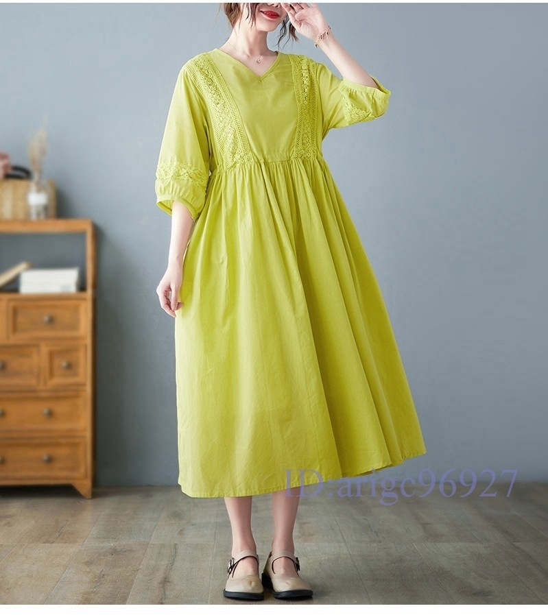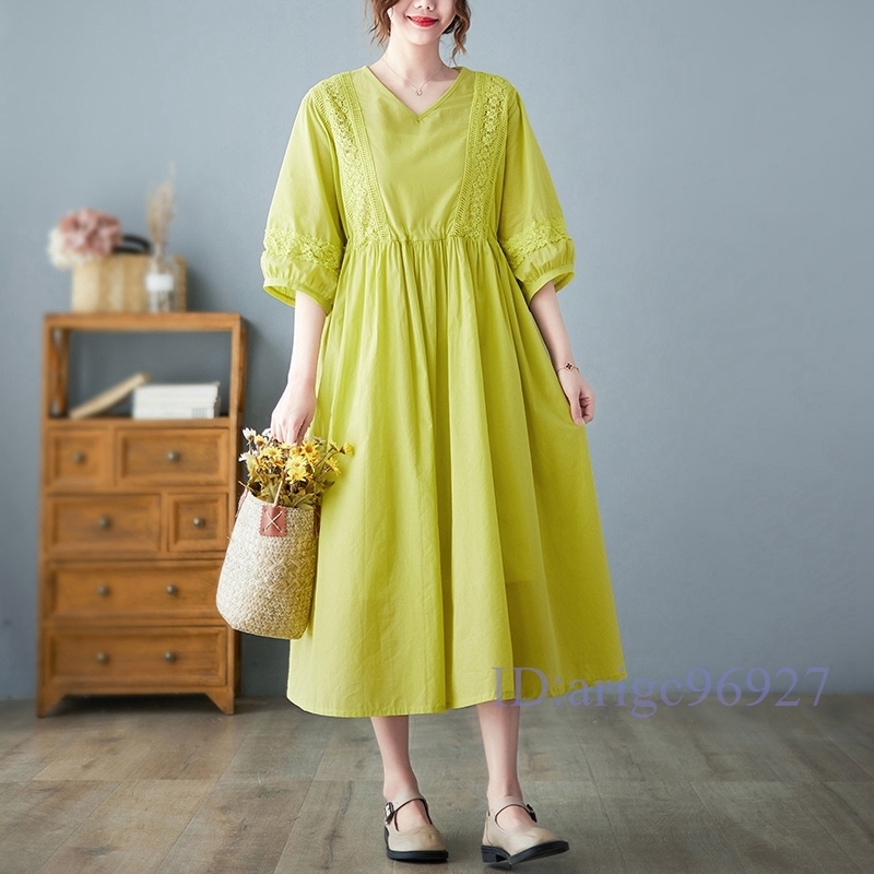 N007★新品春夏*レディース*カジュアル*ナチュラルゆったり大きいサイズ体型カバー*レース付きロングワンピースM~XXL*黄色