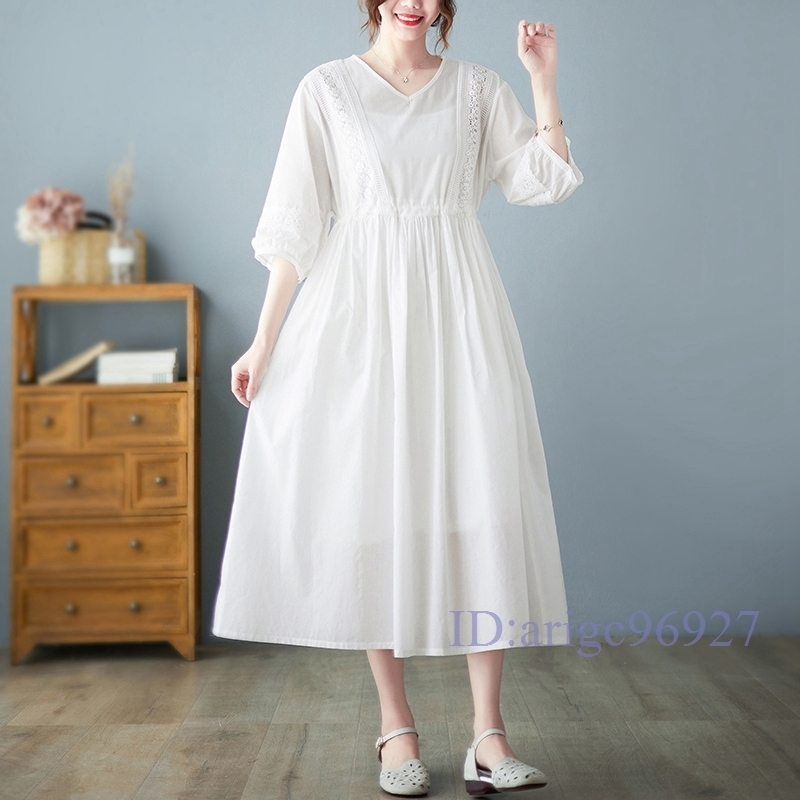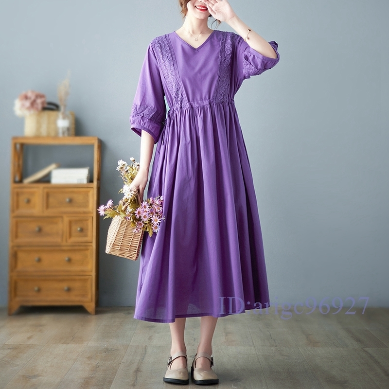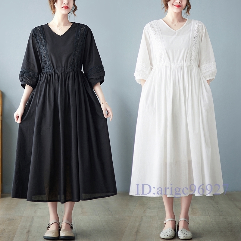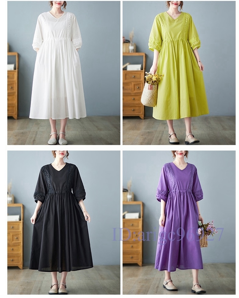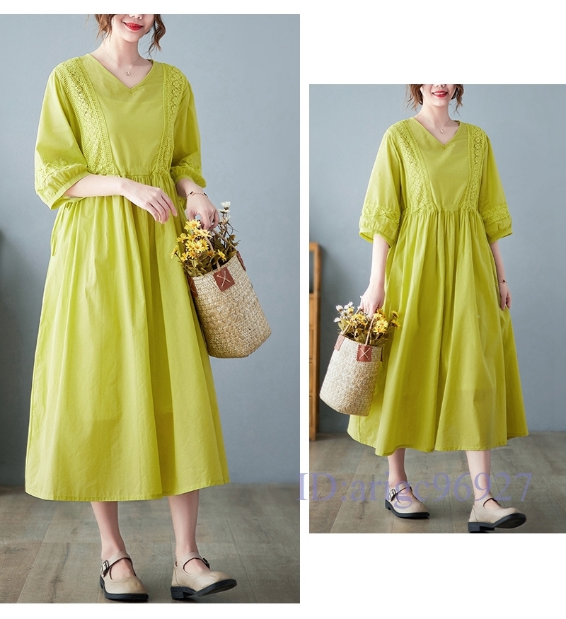 N007★新品春夏*レディース*カジュアル*ナチュラルゆったり大きいサイズ体型カバー*レース付きロングワンピースM~XXL*黄色