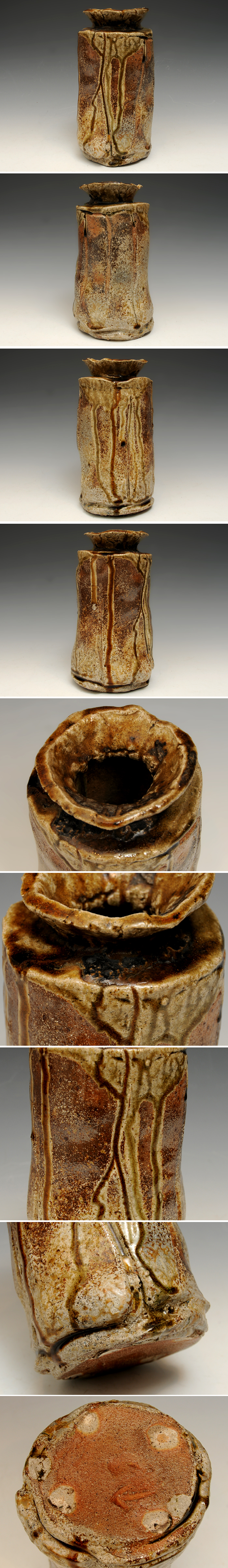 竹梅作 伊賀花生 花入です。 伊賀の土味が良く、 豪快に釉薬が掛けられ、景色が大変素晴らしい花生です。 造形美も素晴らしく、力強く重厚な一品です。 高台底に銘あり。 美品ですのでキズや欠点はなく、良い状態です。 |